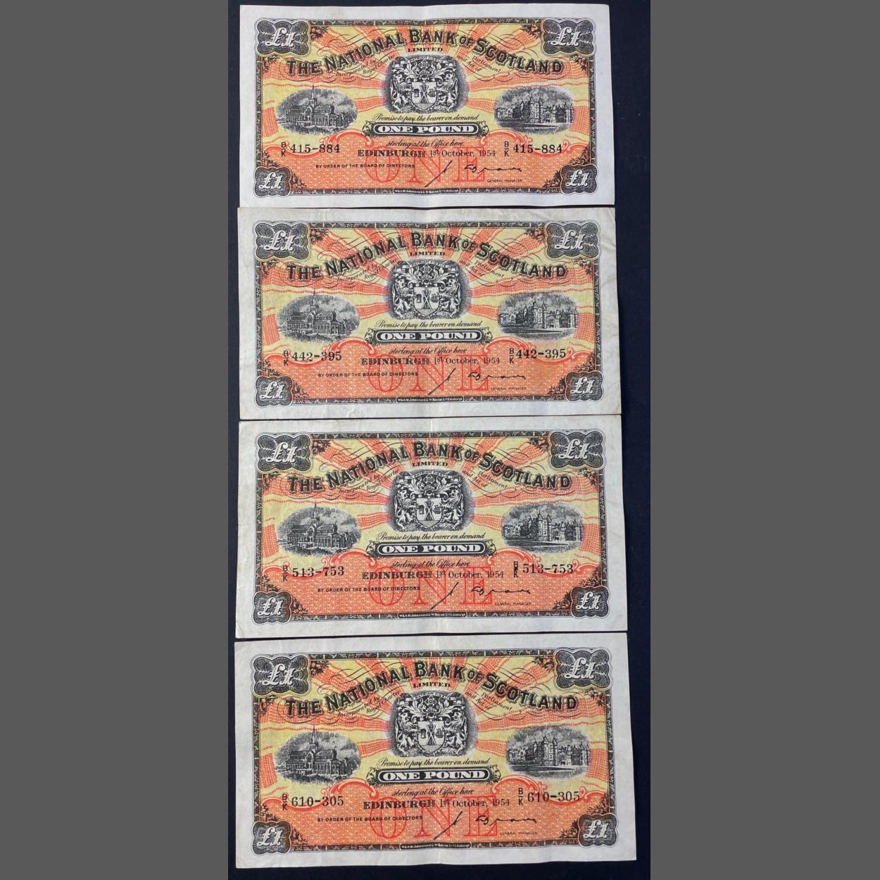 Four NATIONAL BANK OF SCOTLAND 1954 'sunburst' banknotes in good collectible grade with minor wear.