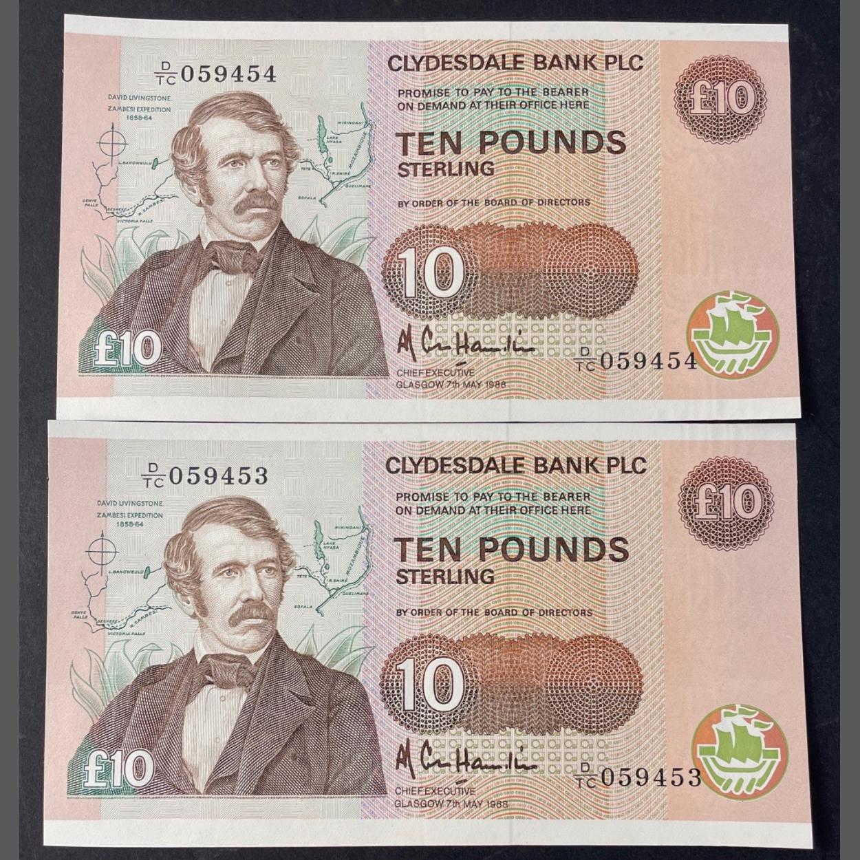 A pair of crisp sequential CLYDESDALE BANK 1988 David Livingstone Ten Pound £10 banknotes in good grade.