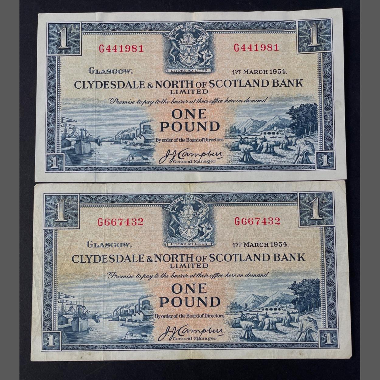 Two CLYDESDALE AND NORTH OF SCOTLAND BANK 1954 One Pound £1 banknotes in good grade.