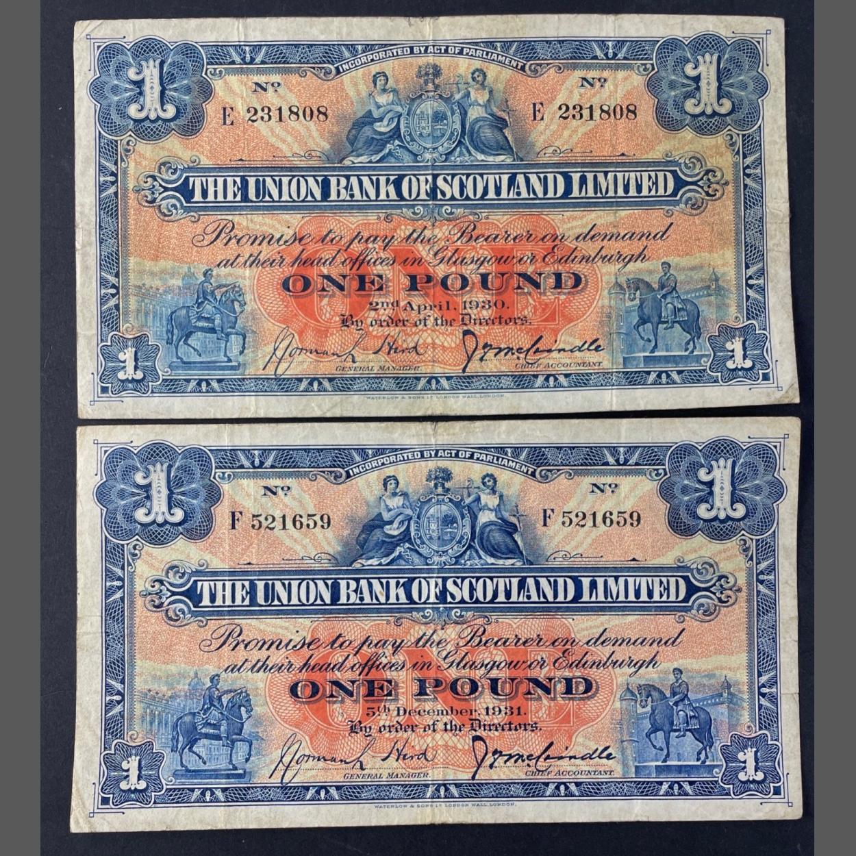 Two UNION BANK OF SCOTLAND 1930 One Pound £1 banknotes with wear but nice collectible notes