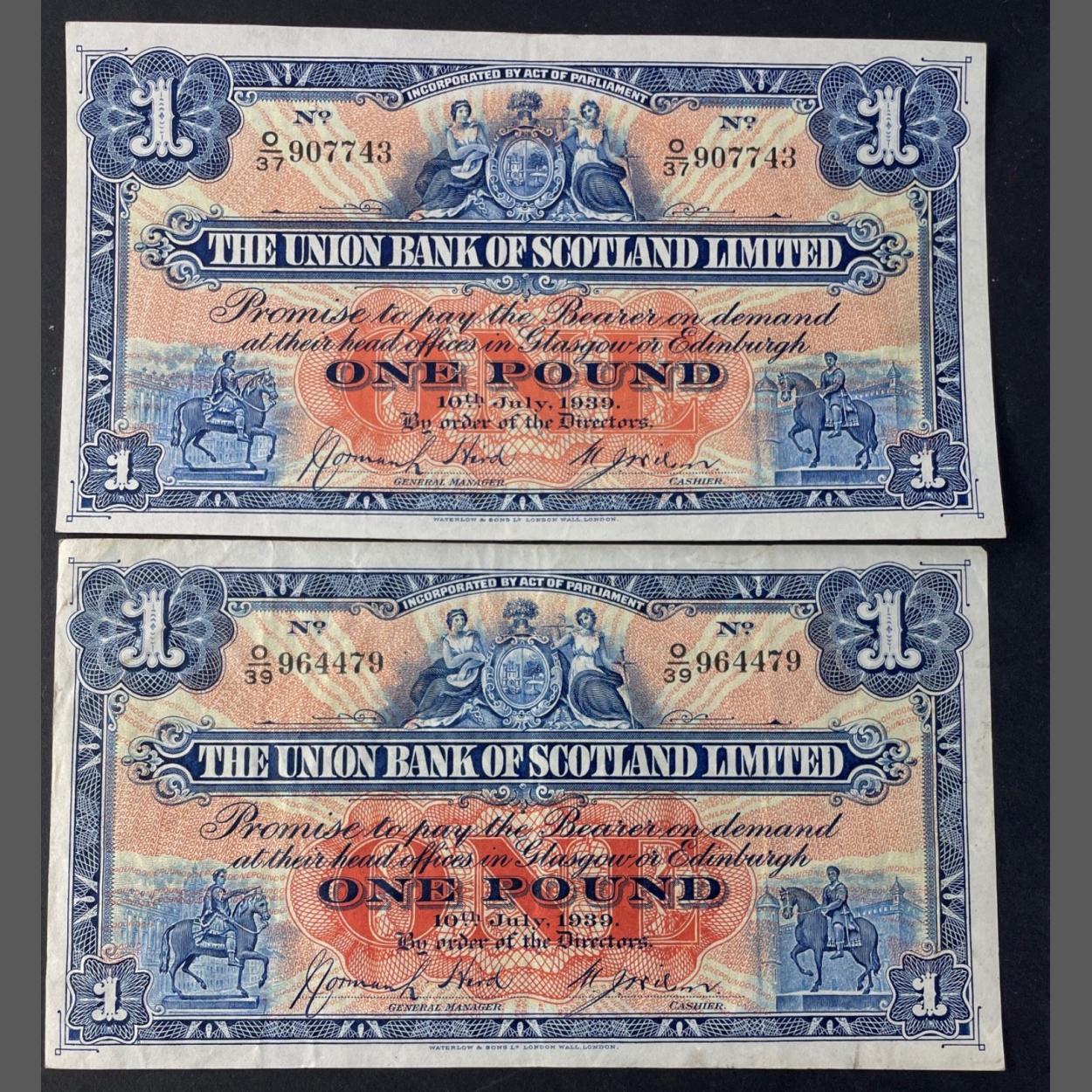 Two UNION BANK OF SCOTLAND 1939 One Pound £1 banknotes with wear but nice collectible notes