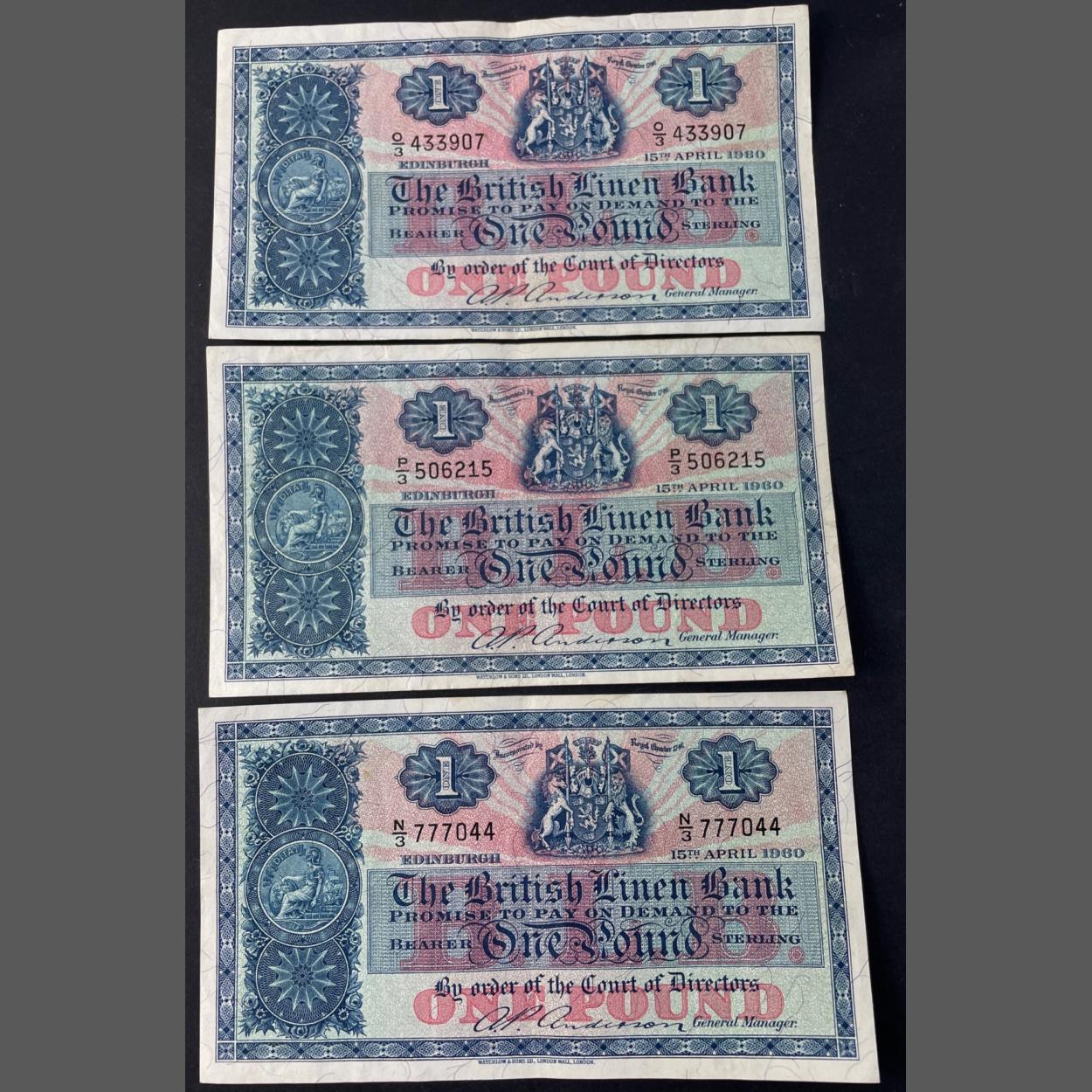 Three BRITISH LINEN BANK OF SCOTLAND 1930 One Pound £1 banknotes with wear but nice collectible notes