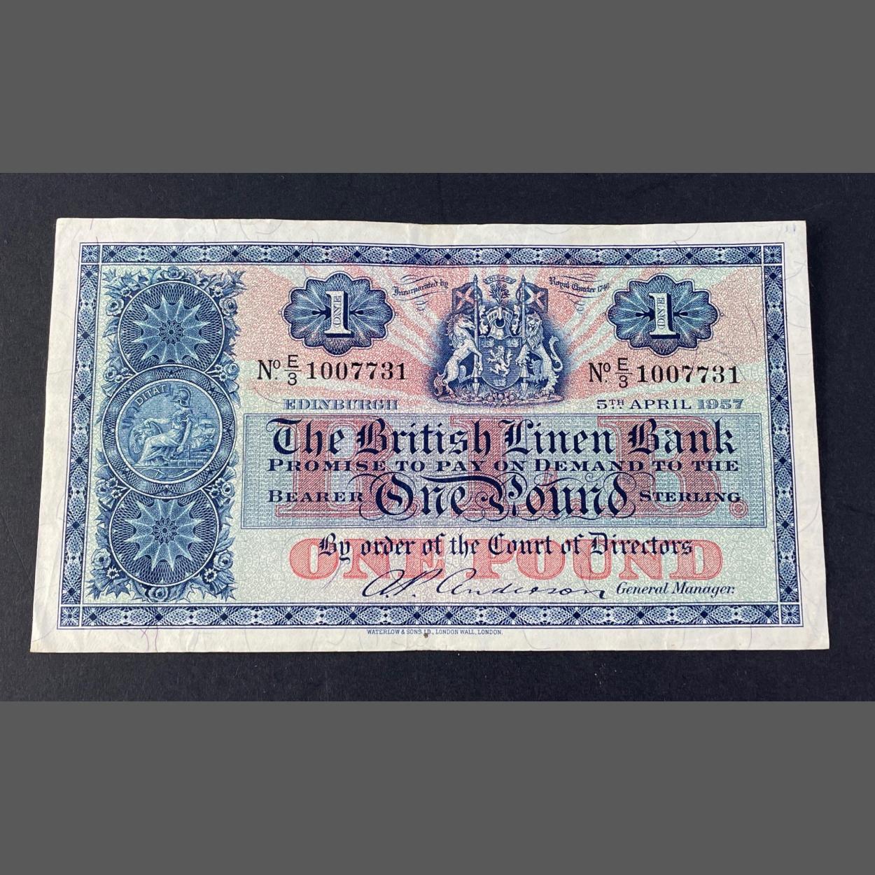 Unusual BRITISH LINEN BANK 1957 ''OVER'' One Pound Banknote from 1957. Seven digit serial number, only 10,000 printed. One for the knowledgeable specialist in good collectible grade.