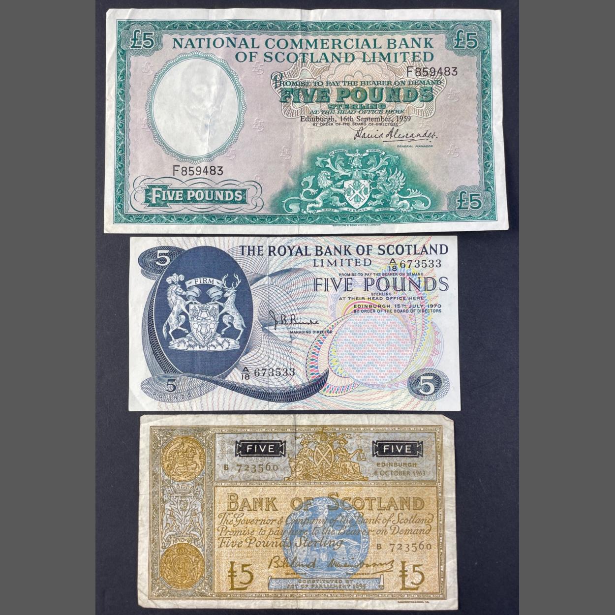 Super SCOTTISH BANKNOTE lot to include 1959 National Commercial £5 in good order with some light folds, a Royal Bank of Scotland 1970 £5 with light creasing and a Bank of Scotland 1963 £5 with wear. A nice collection.