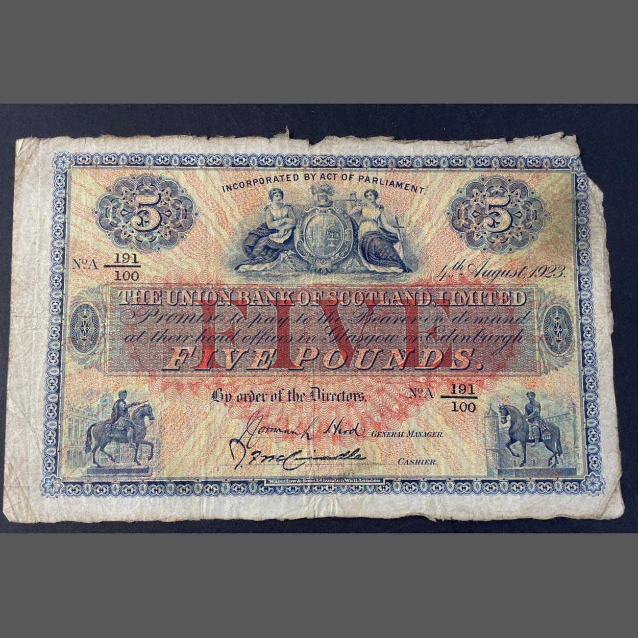 A lovely early 1923 UNION BANK OF SCOTLAND Hird Five Pounds £5 banknote with expected wear. A super survivor to grace any collection.