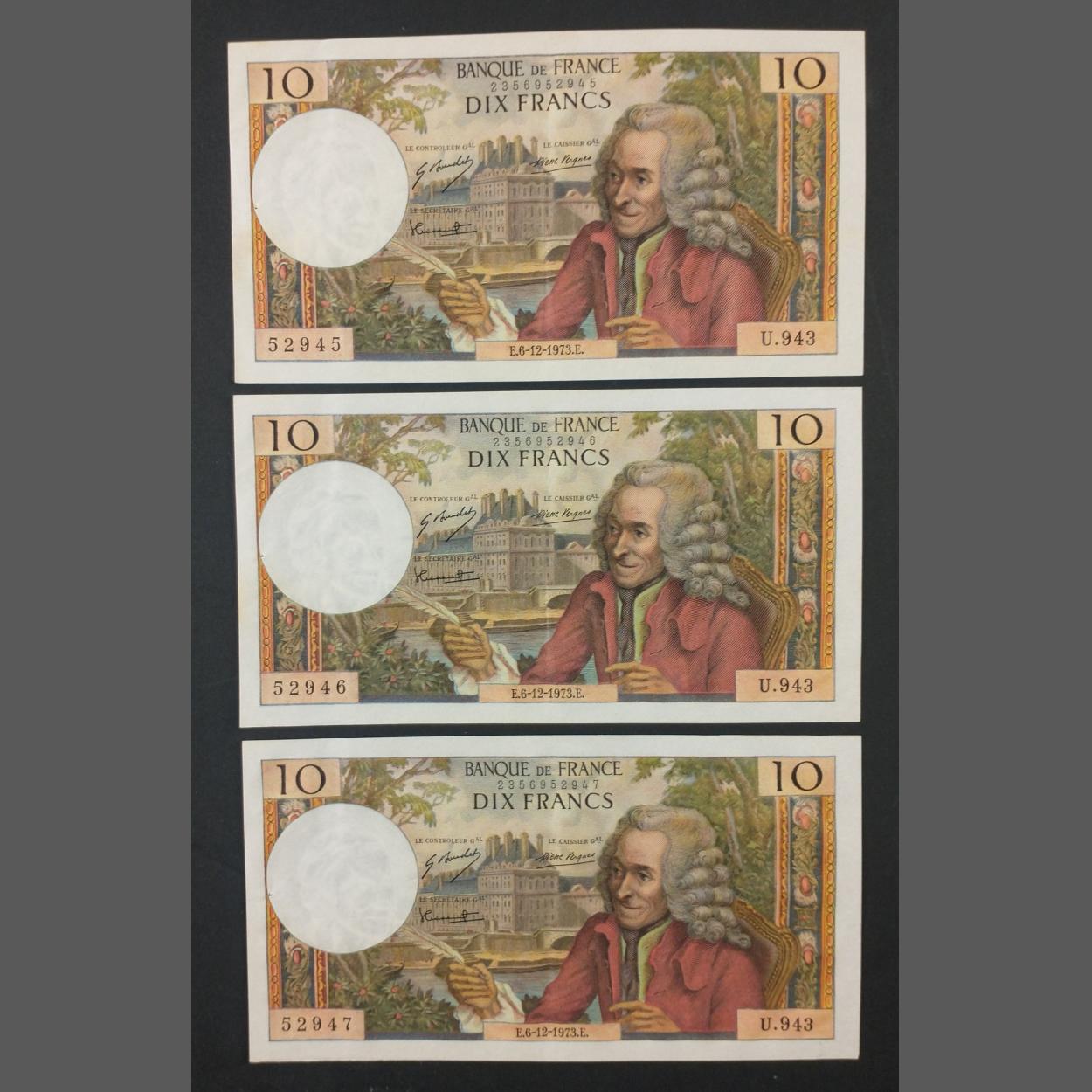 FRANCE Banknote interest. A nice trio of sequential early 1970's Banque de France DIX FRANCS 'VOLTAIRE' banknotes in collectible grade. Notes each have a pinhole, a centre fold, minor creasing and minor staining near edge under close inspection . Still beautiful examples of the art.