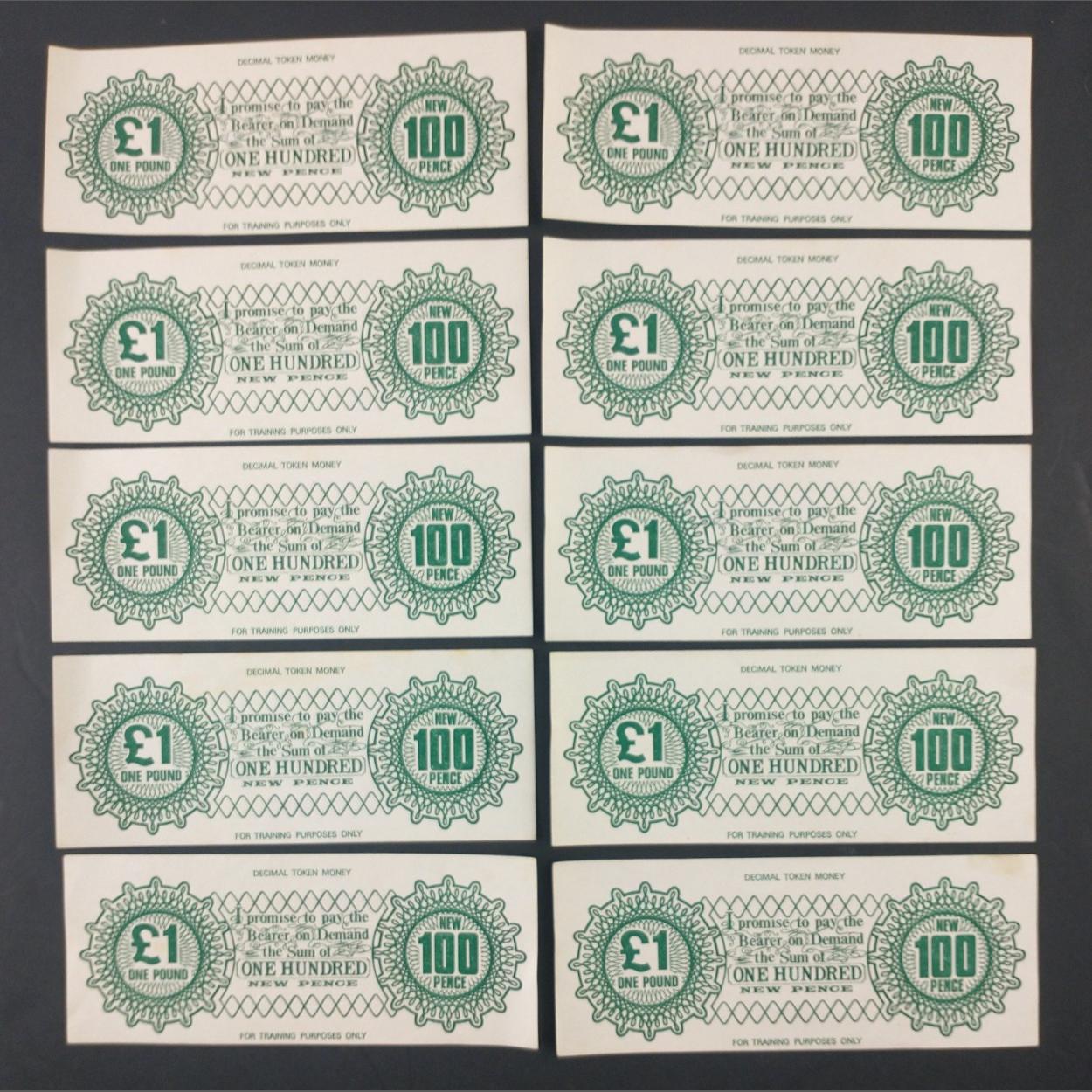 For the enthusiastic Numismatist that has everything. A quantity of ten Decimal Token Money Training notes, believed issued to bank staff pre decimilisation. Interesting collectible items.