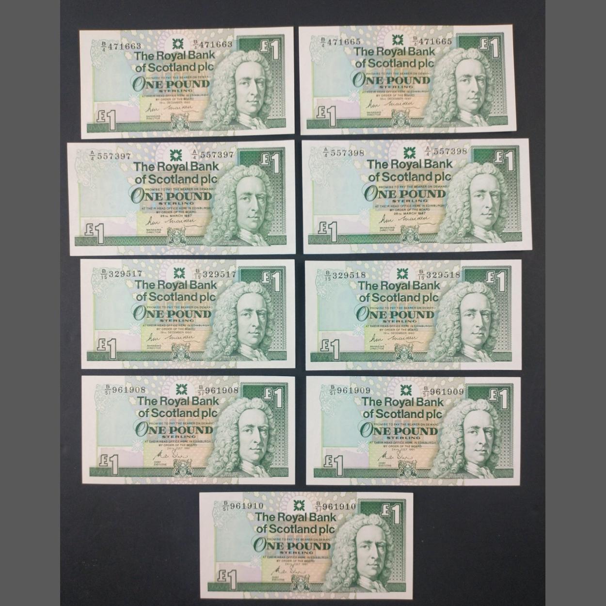 A group of nine mixed ROYAL BANK OF SCOTLAND One Pound banknotes. Includes a sequential run of three and two further pairs. Lovely crisp notes.