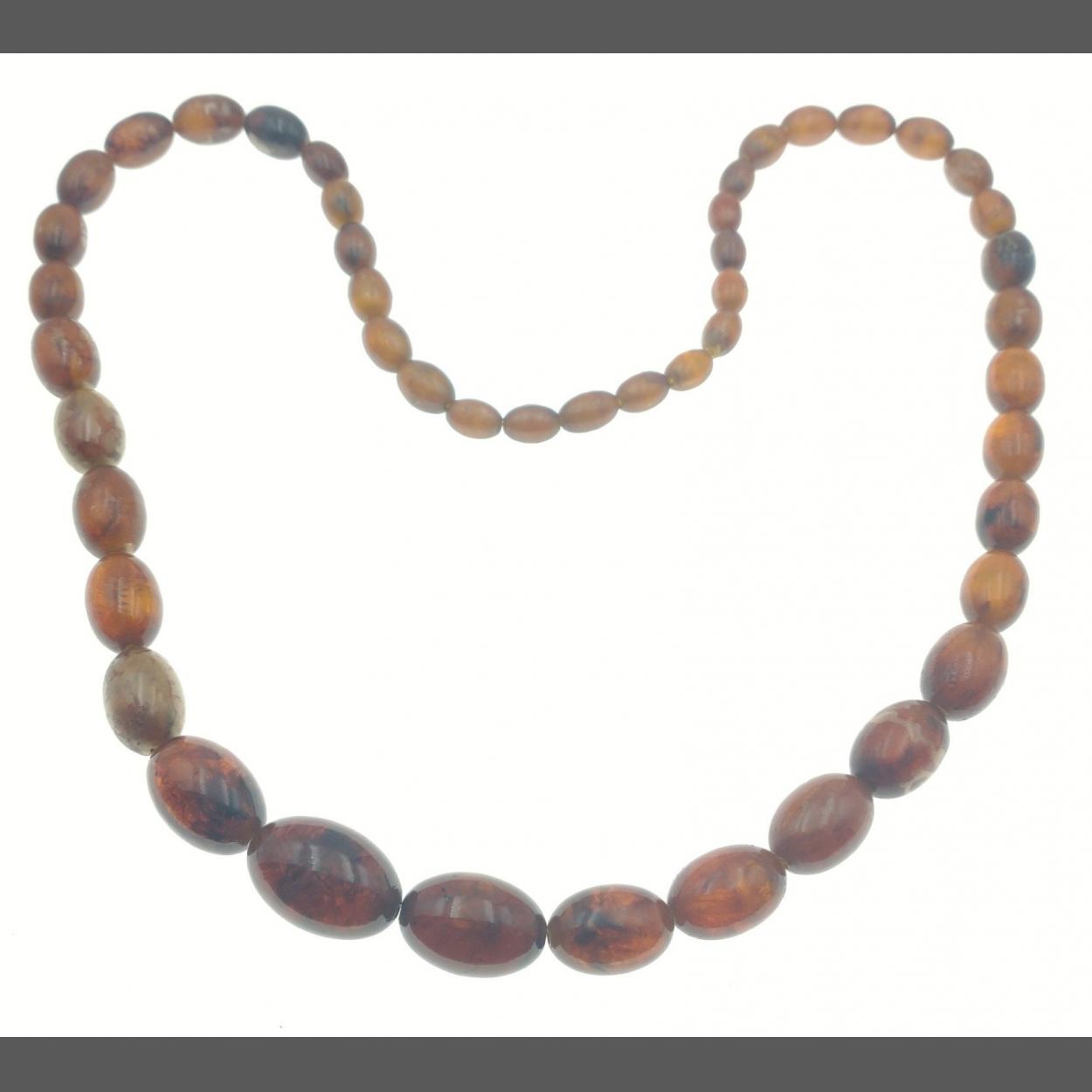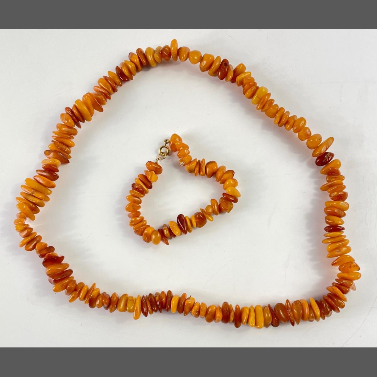 A string of amber beads, approx 56cm long with matching bracelet 20cm long, gross weight 63.7g approx