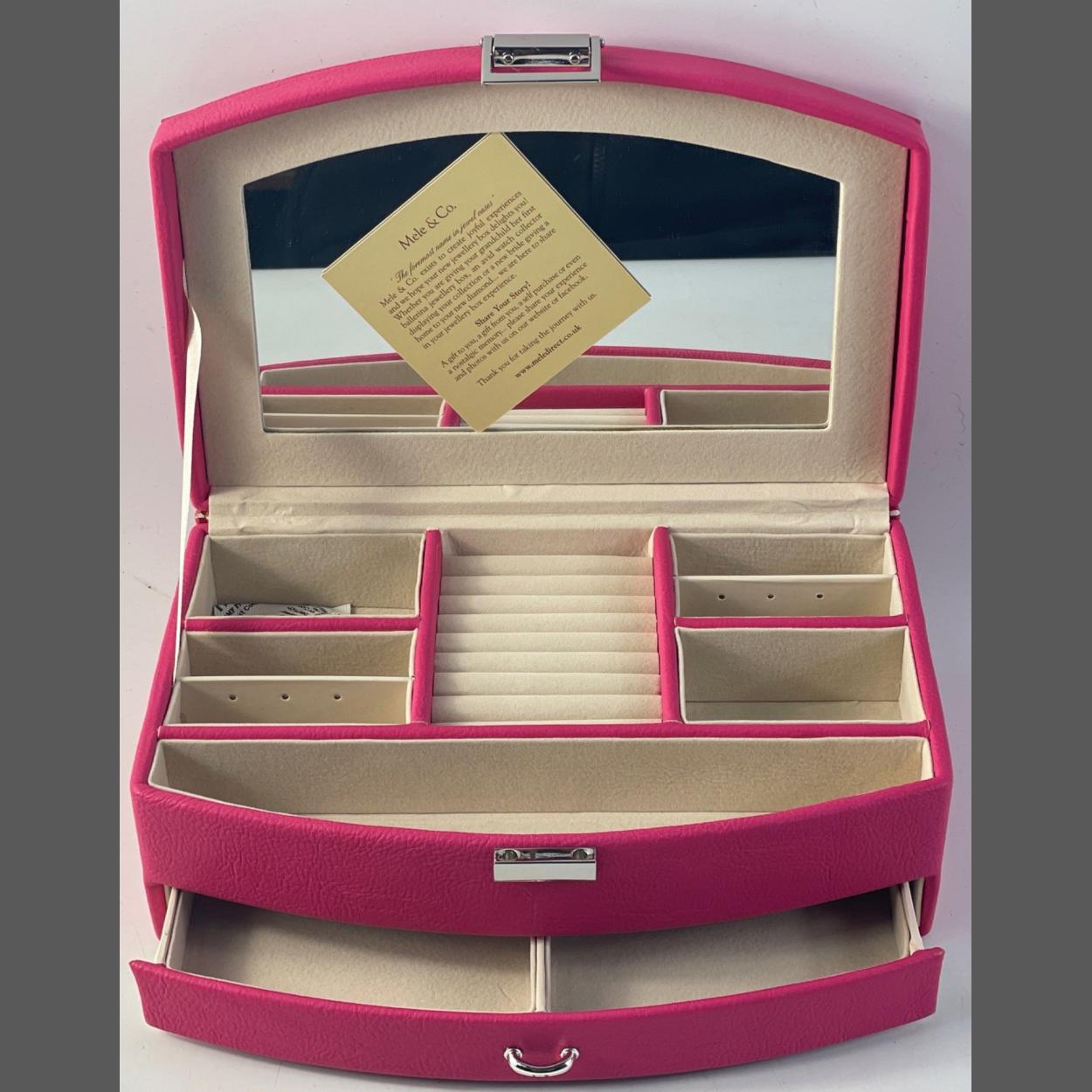 SUPER QUALITY! A BRAND NEW UNUSED and still in original packaging pink leather effect two tiered jewellery box - dimensions 26cm x 17cm x 10cm height approx