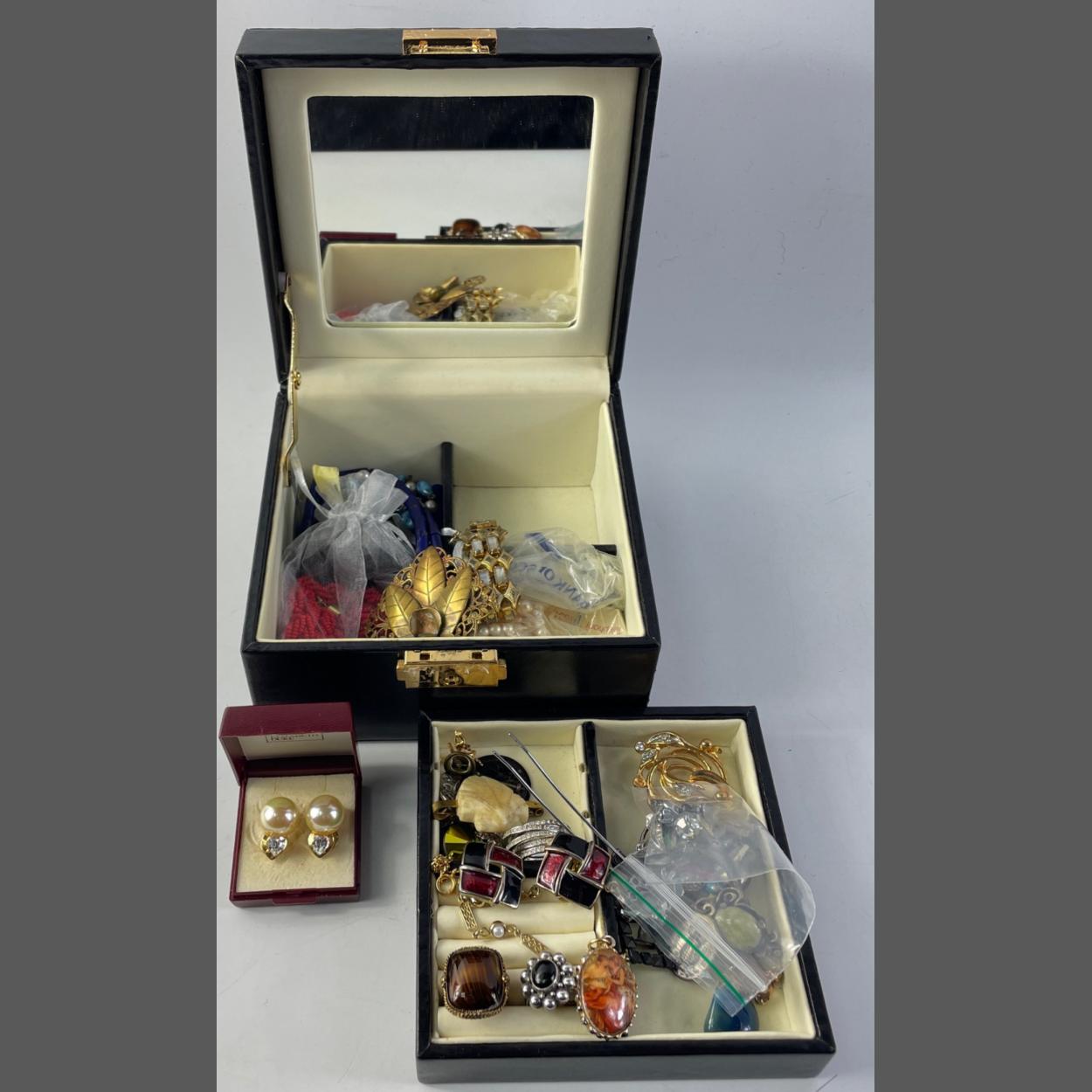 Super lot of bling bijouterie in a pretty little jewellery carry case. Some lovely interesting pieces, all costume.