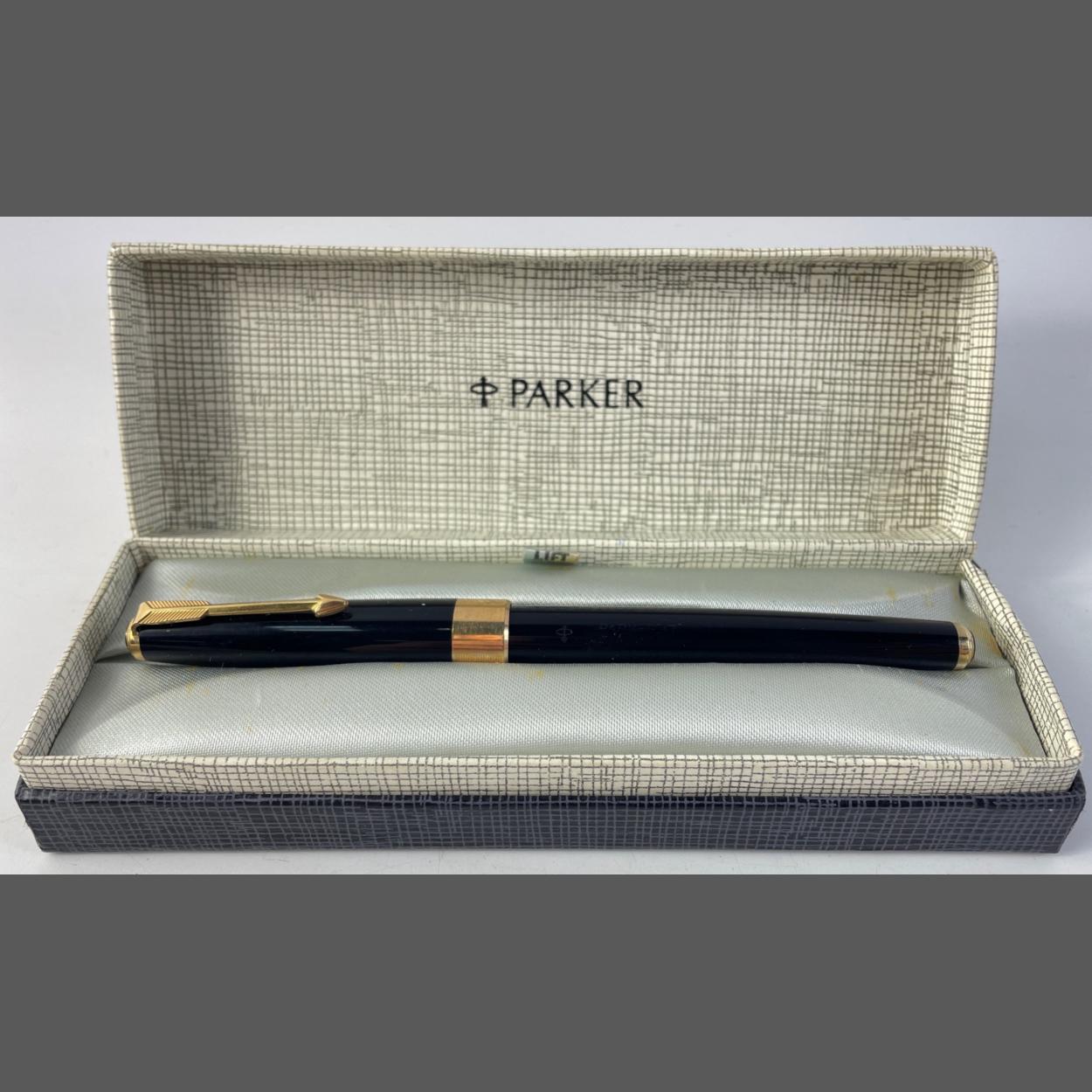 A SLEEK Black and goldish yellow metal vintage PARKER fountain pen within a PARKER presentation box - dimension 13.5cm in length approx