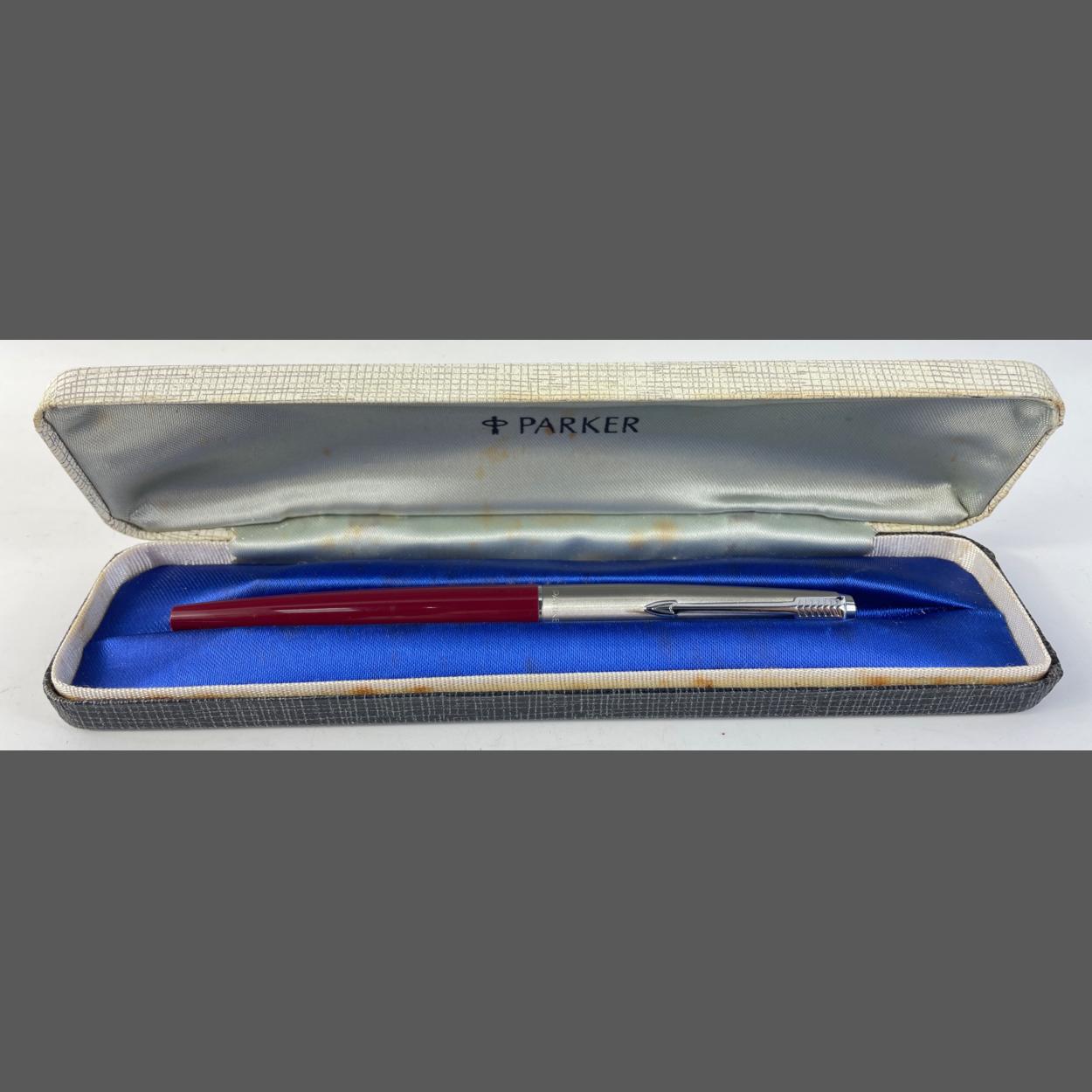 A VINTAGE PARKER 14k nib branded fountain pen in deep red livery with stainless steel top half - all within a Parker presentation box - pen dimension 14.5cm approx