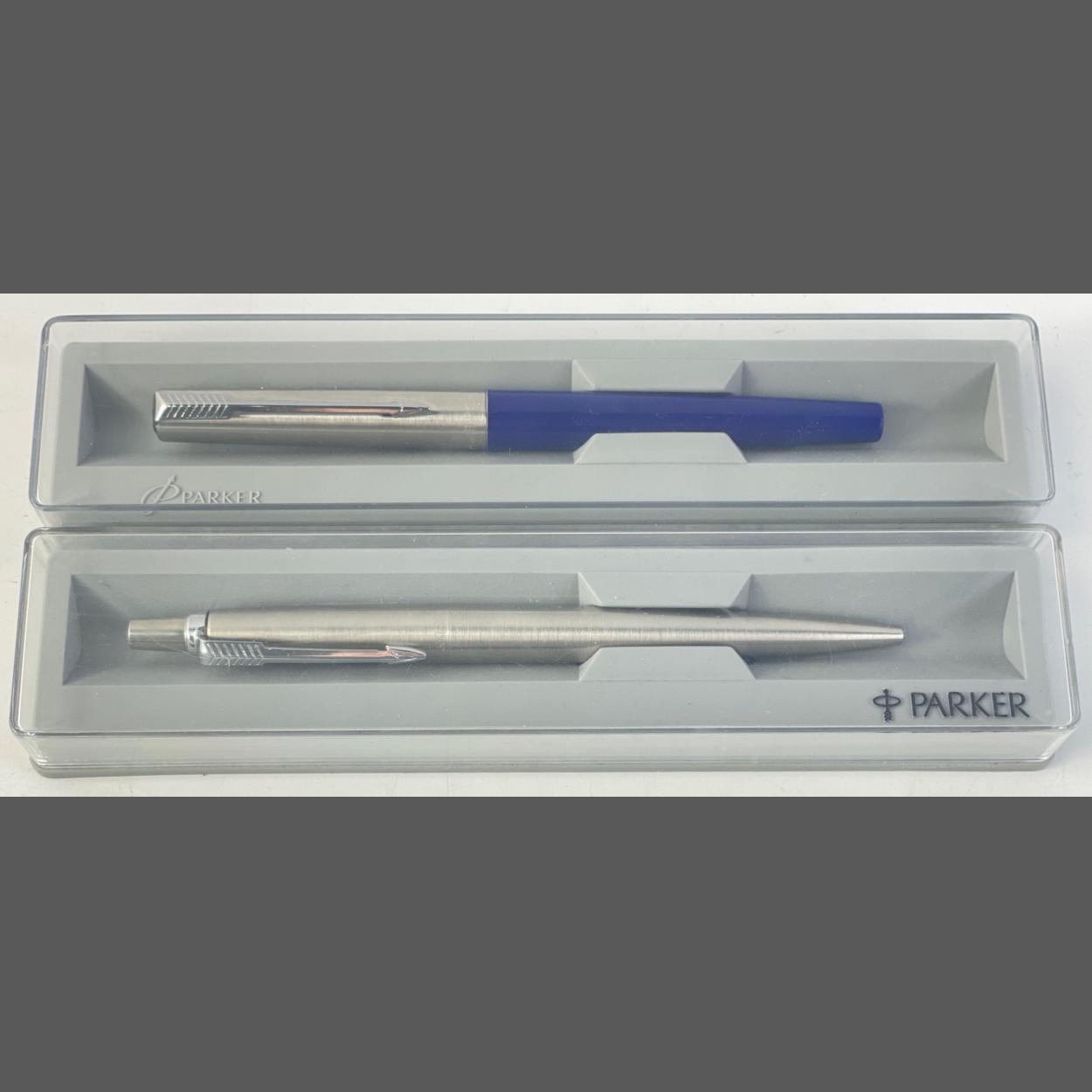 TWO PARKERS - Two Parker pens to include a royal blue livery and stainless steel fountain pen within its perspex case dimension 12.5cm length approx with also a stainless steel body ballpoint PARKER pen within its original perspex presentation case