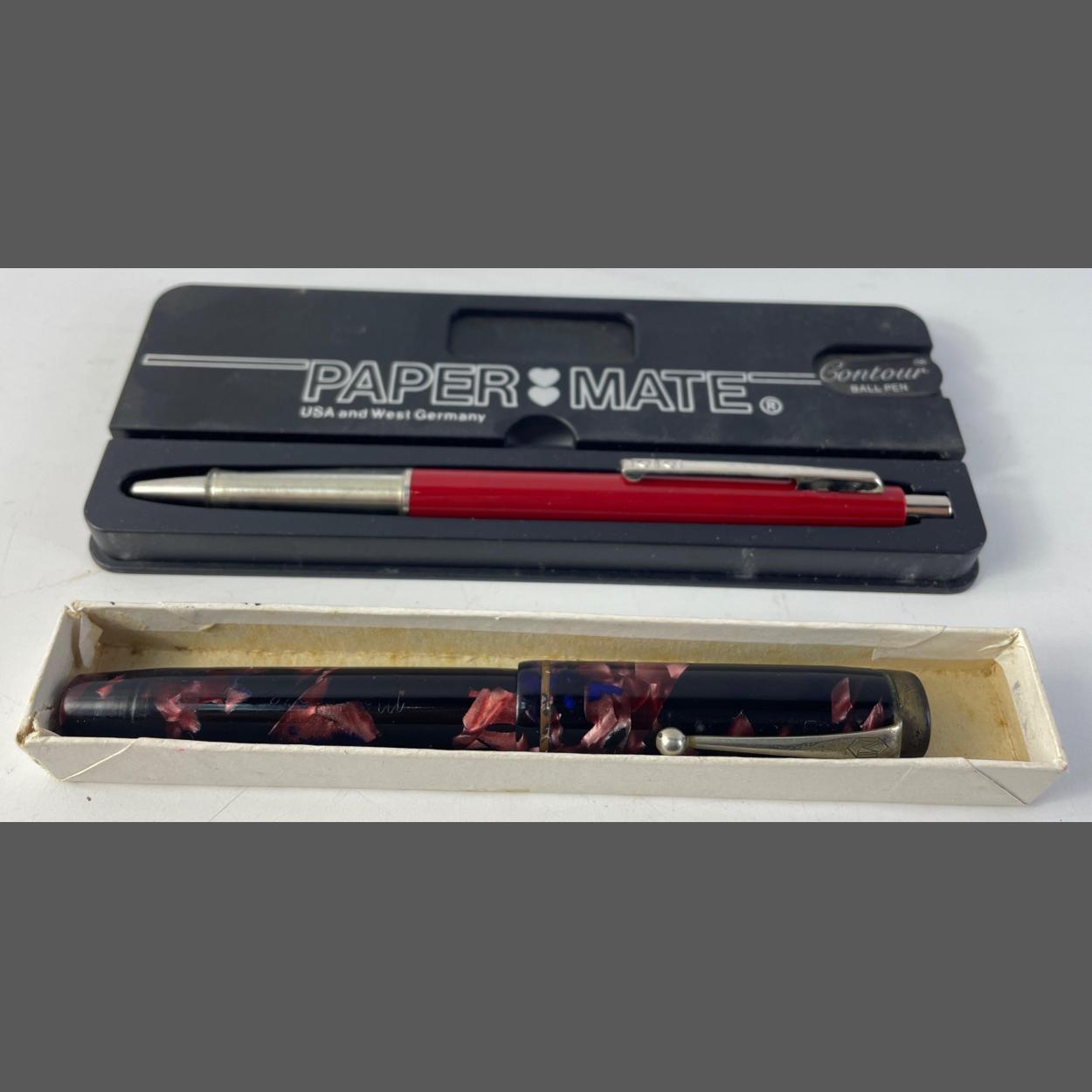 MENTMORE Autoflow with a stamped PARKER 14ct gold nib iridium pointed fountain pen within a Mentmore box with also a packaged PAPERMATE Contour all pen with a deep red livery and stainless steel bottom 1/3rd part