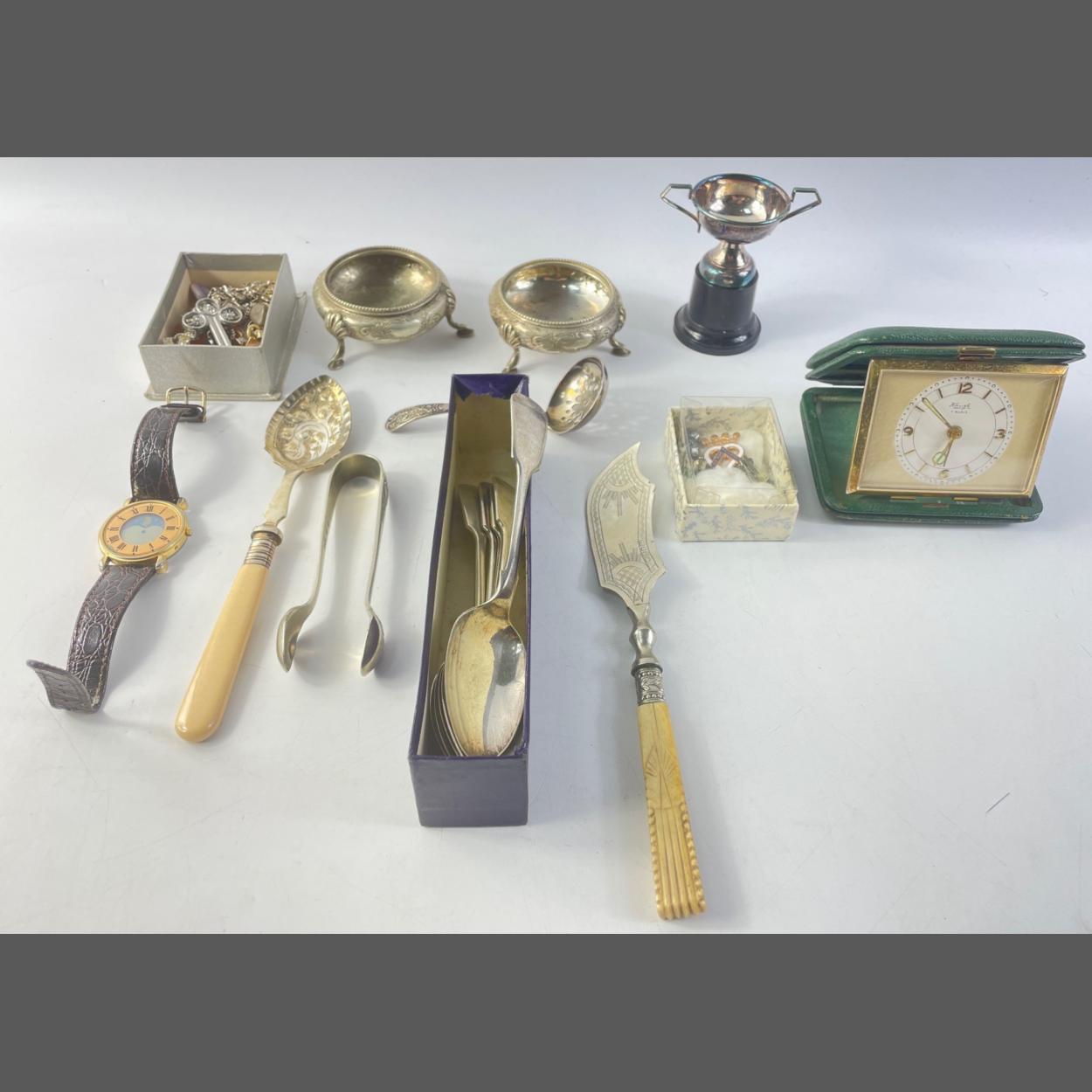 A mixed box of interesting costume jewellery, a small white metal cup, a travel alarm clock etc