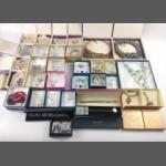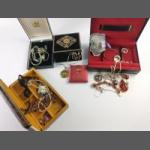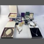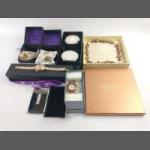 (VNS)A collection of some boxed costume jewellery to include MiSaki Japanese pearls, a white metal pocket watch, a brooch, a lovely pendant with a large clear stone etc plus a nice Jacquelle compact