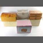 Three new, unused, boxed MELE & CO jewellery boxes with floral inlay oak, one with rounded lid (29x20x13cm), and one chest of drawers style (25x16x15cm),,