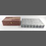 Jewellery boxes to display plenty of rings one of which looks like a white metal foolscap book with space for 100 rings, measures 37x26cm, one carved and inlaid wood with 2 tiers with space for 56 rings and a four section space in the base of the box plus mirror (30x20x10cm), great for craft fairs etc