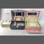 Three new, unused jewellery boxes to include one in a trunk style in blue with leather edging and a cantilevered interior and mirror, 27x18x14cm, one a 2 tiered faux leather cream case 30x20x10cm and a smaller cream box with lift-out ring section and magnetic catch 18x13x9cm