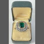 An unmarked UNUSUAL large ring with unmarked yellow metal bands with surrounding marcasite stones and a central HUGE EMERALD inspired stone -ring size M gross weight 9.36g approx