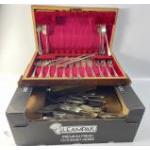A box of mixed EPNS cutlery including a partial boxed set of 9 fish knives and 12 forks (box in need of repair)