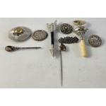 A collection of mainly Hallmarked silver Scottish jewellery items with also an old Hallmarked baby's rattle/teething ring