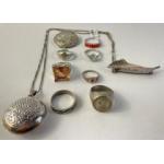 A small lot of silver hallmarked items including six rings, two brooches and a silver pendant on white metal chain. Total gross weight 58g approx.