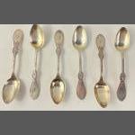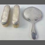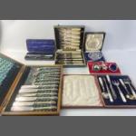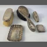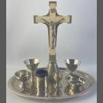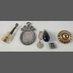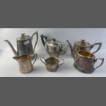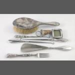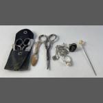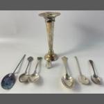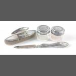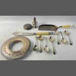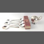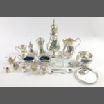 An interesting collection of hallmarked silver to include a creamer and sugar bowl Birmingham 1965, weight 224g approx made by SJ Rose and Son, a sugar shaker 18cm tall, Birmingham 1909, weight 156g approx, a miniature tea and coffee set on a tray (8.5cm dia), Birmingham 1973, weight 66.4g approx, 2 condiment dishes both with blue glass liners and spoons, both Birmingham of different dates, gross weight 130g approx, a mini tankard Birmingham 1971, weight 38.97g approx, a glass perfume bottle with silver collar (faded hallmark), 2 small glass jars with silver lids Birmingham 1934, salt grinder, small cat etc