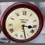 FABULOUS PATINA! An ANTIQUE VICTORIAN LATIMER & SONS of EDINBURGH CLOCKMAKERS Railway Station style mahogany cased wall clock - with weighted pendulum - there is no winding key with the clock and the clock is missing the four attachment side-on screws( which can be easily replaced) Clock case diameter 15” - clock face diameter 12”(30cm) approx - the clock at one point has had a glass and metal hinged face- and only part of the hinge is left