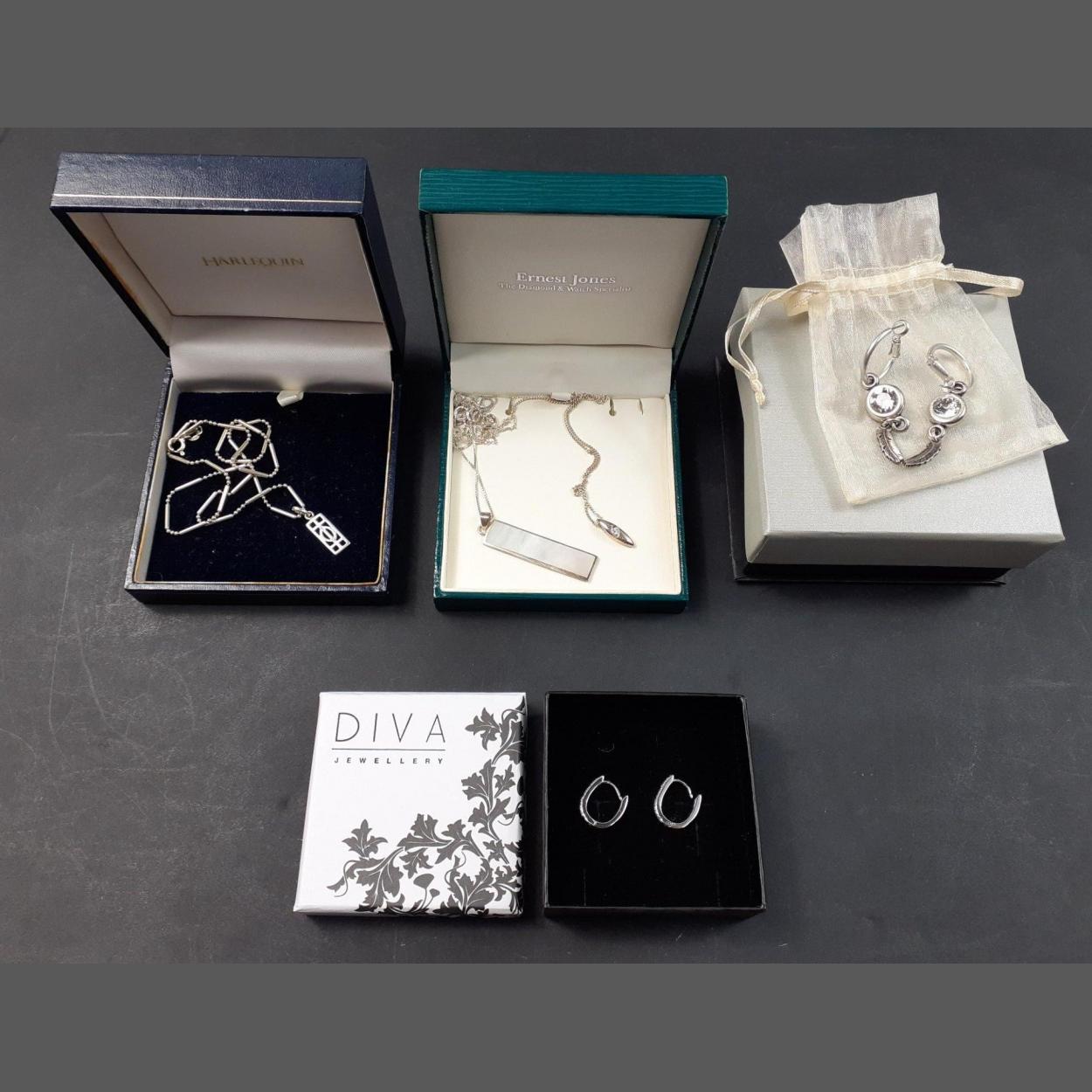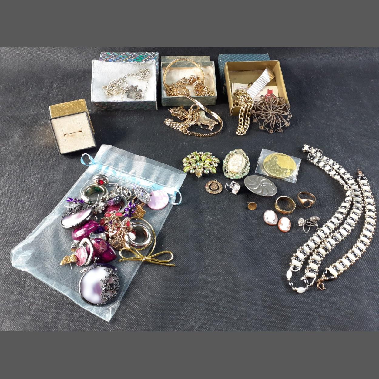 A selection of quality boxed costume jewellery to include necklaces, earrings, brooches, gold club cuff links, belt-buckle, etc