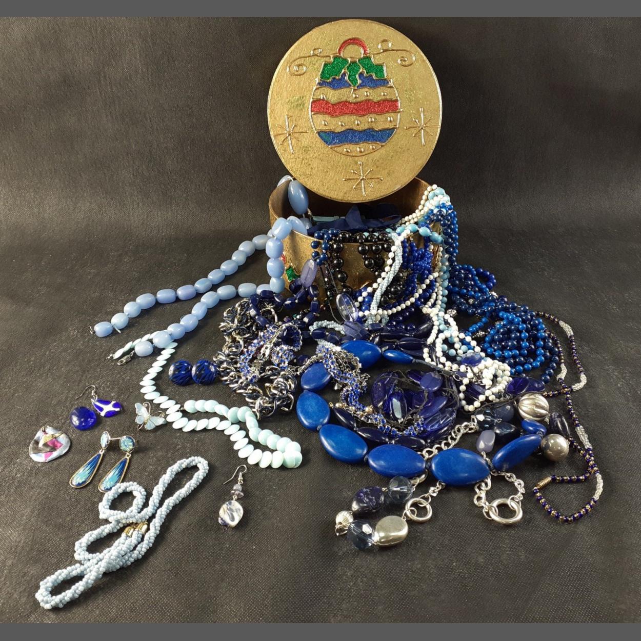 A cheerful Christmas box (18cm dia) jammed full of blue costume jewellery