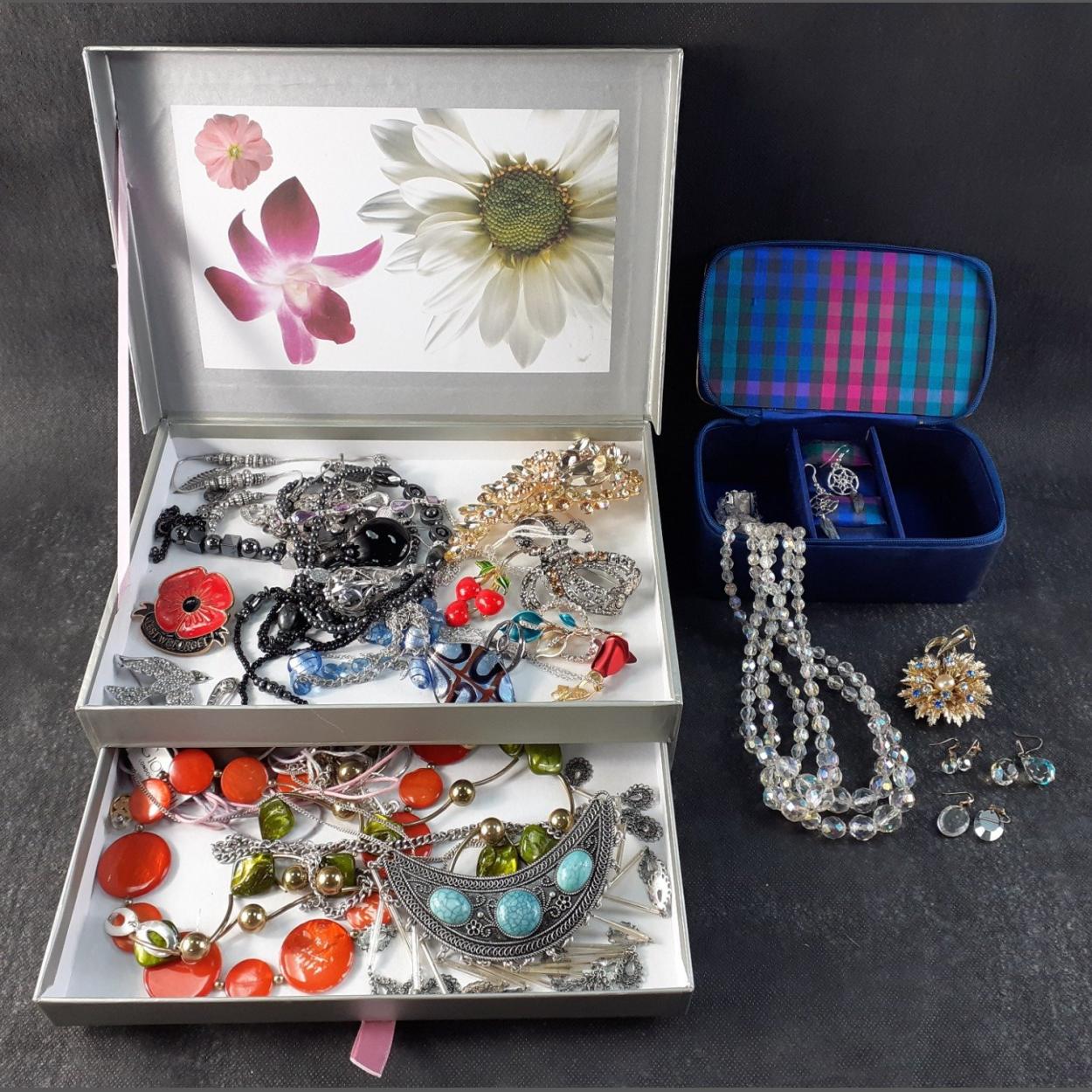 A costume jewellery lot to include a small fabric covered travelling jewellery box 16x9x6cm complete with contents of bedazzling brooches etc