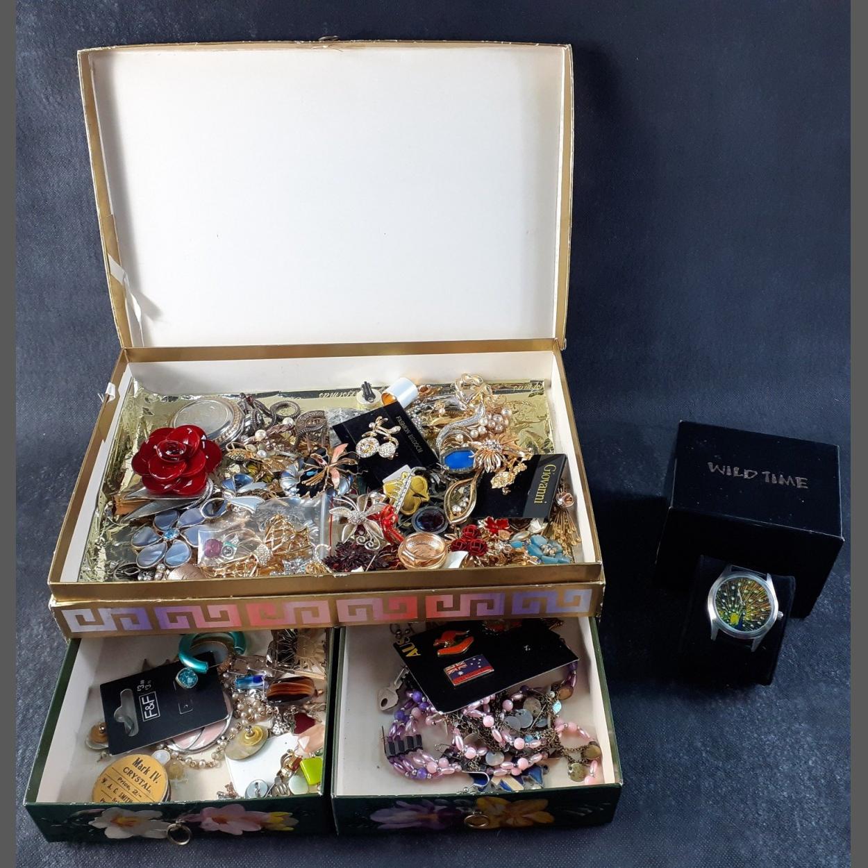 A boxed collection of costume jewellery to include many enamelled brooches, a ROJAS pocket watch, and a boxed WILD TIME watch (02481) with peacock face and clear stones