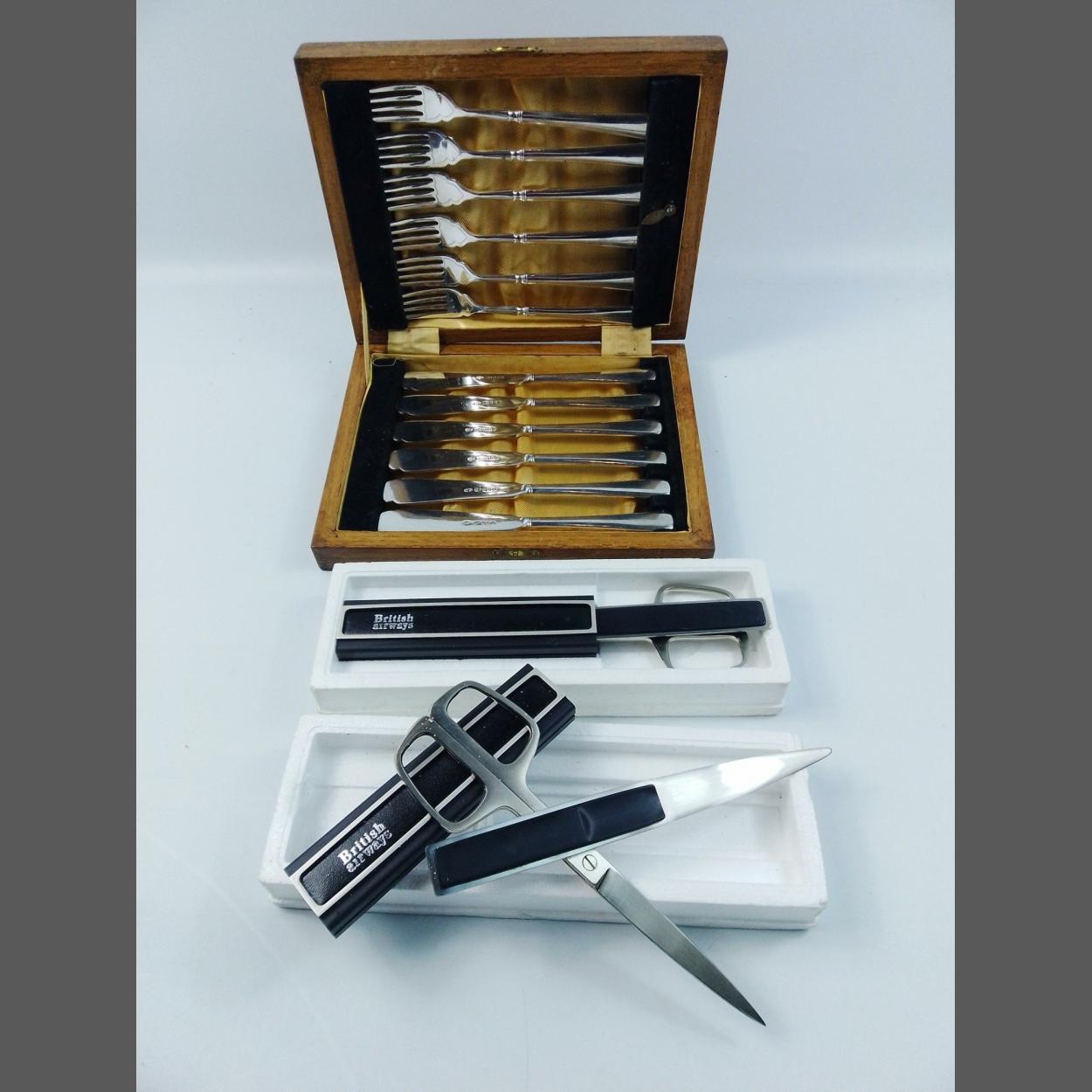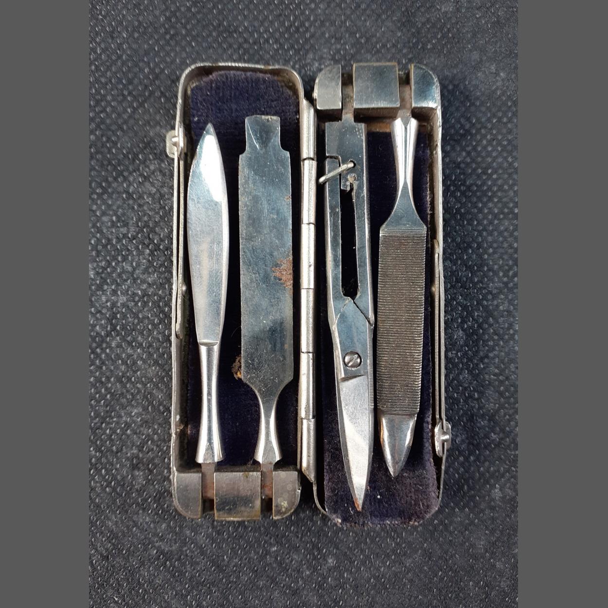 A lovely aluminium cased gentleman's manicure set. All pieces hinge out nicely, a little surface spotting but would clean up lovely.