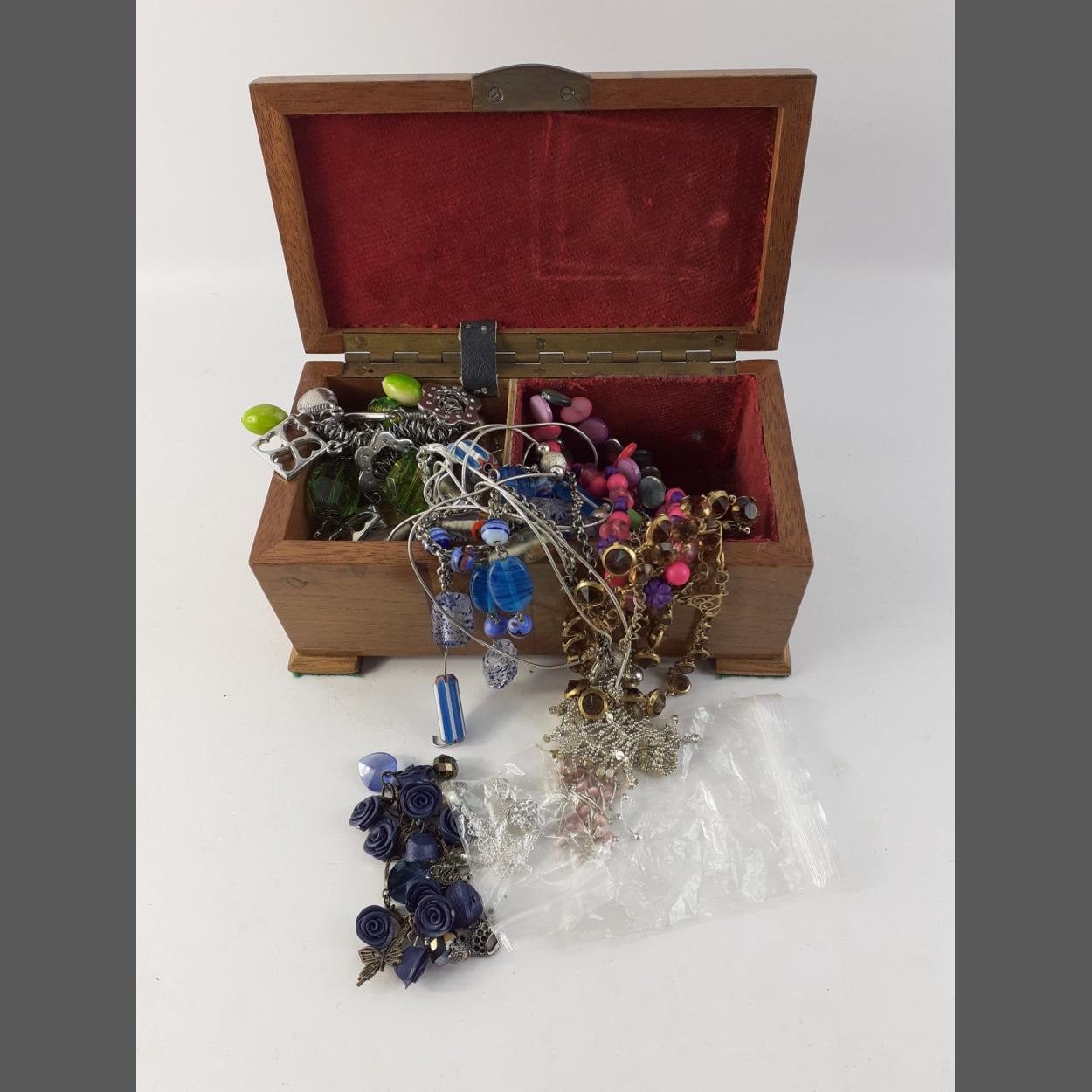 A wooden musical jewellery box with a quantity of costume jewellery 18x10x8cm