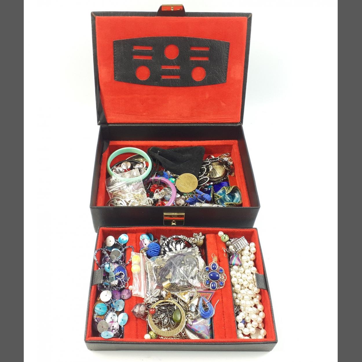 A black jewellery box with lift-out shelf and contents of costume jewellery 24x17x7cm approx