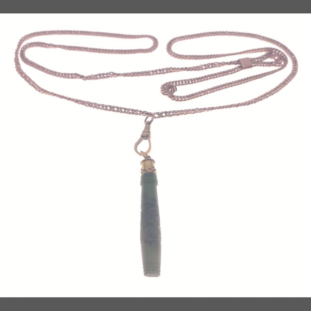 A jade pendant 5cm long with a carved face with 9c chain approx 90cm, weight approx 26g. Total gross weight 33.25g approx