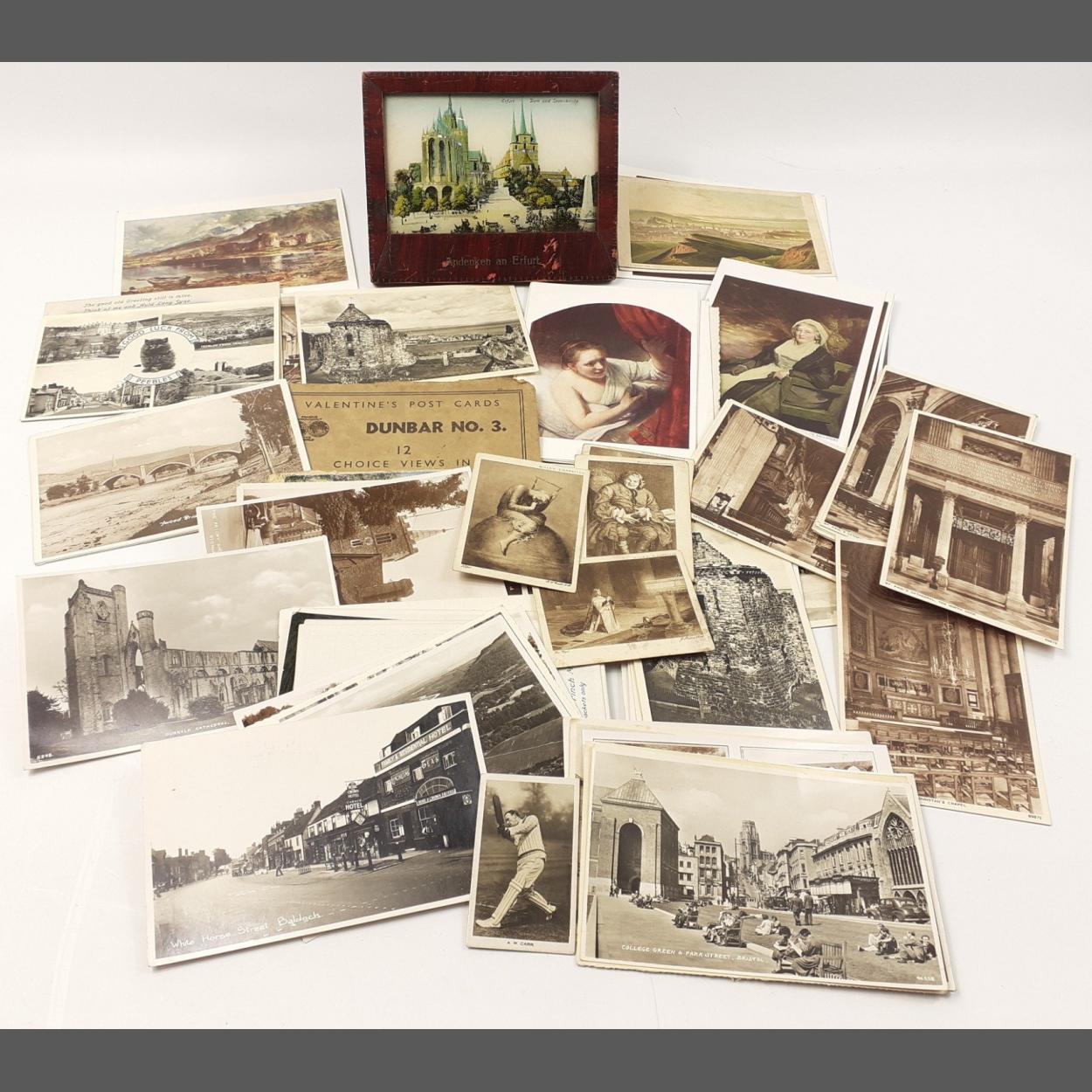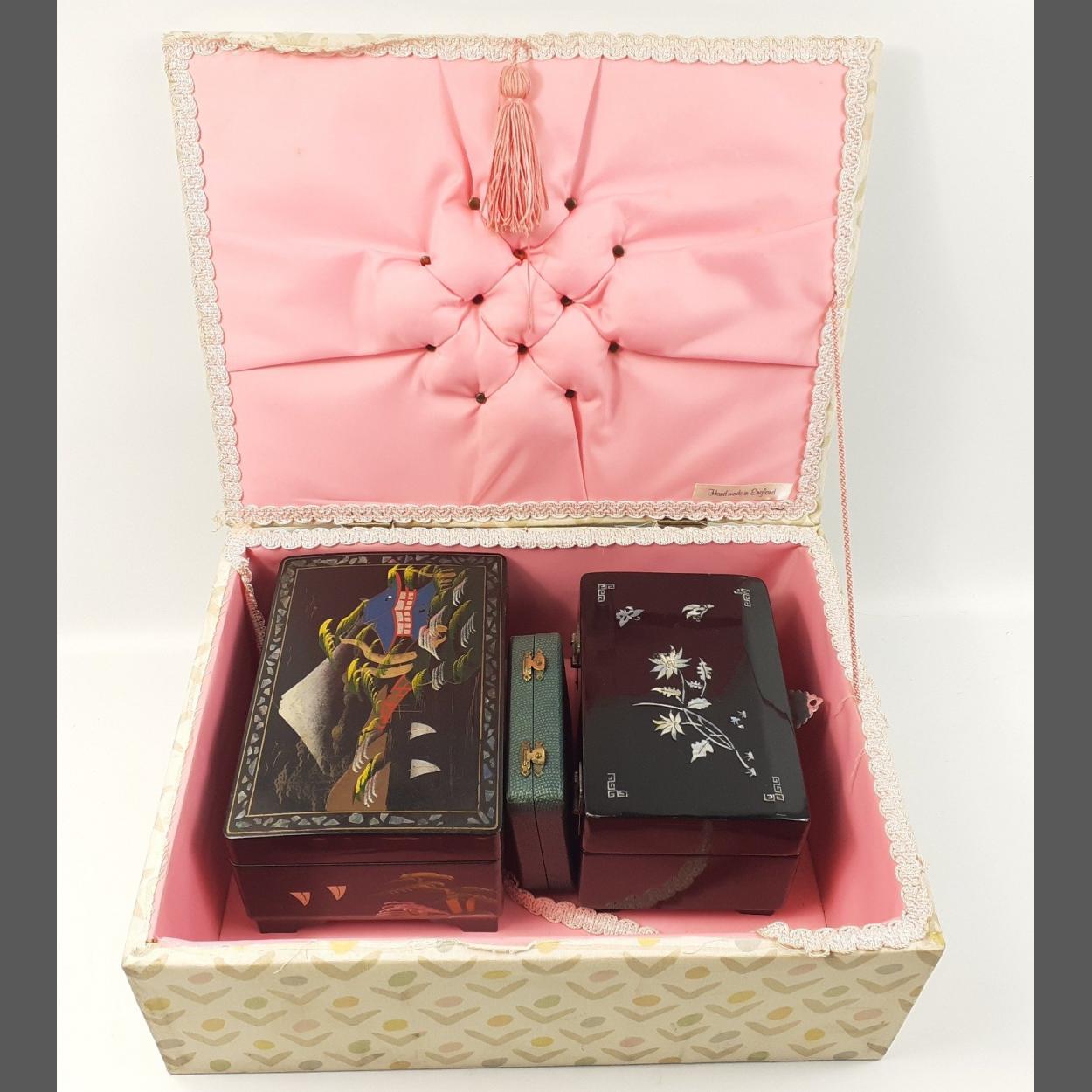 A beautifully constructed wooden silk lined padded keepsake box containing a quantity of WWI silk postcards and other memento silk items. A poignant little lot contained in a lovely box. 28x20x15cm