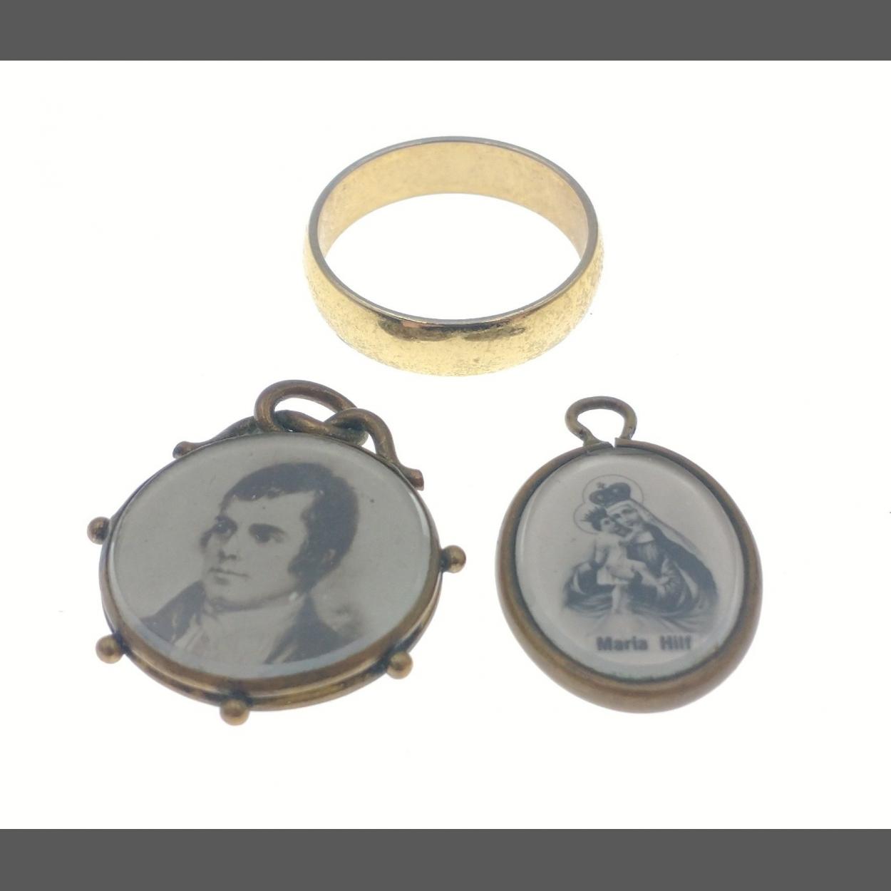 An unmarked yellow metal wedding band size P, weight 2.35g approx plus 2 small pendants one with Robert Burns /Burns' cottage, 25mm long, the other the Madonna with child/ Maria Hilf 20mm long
