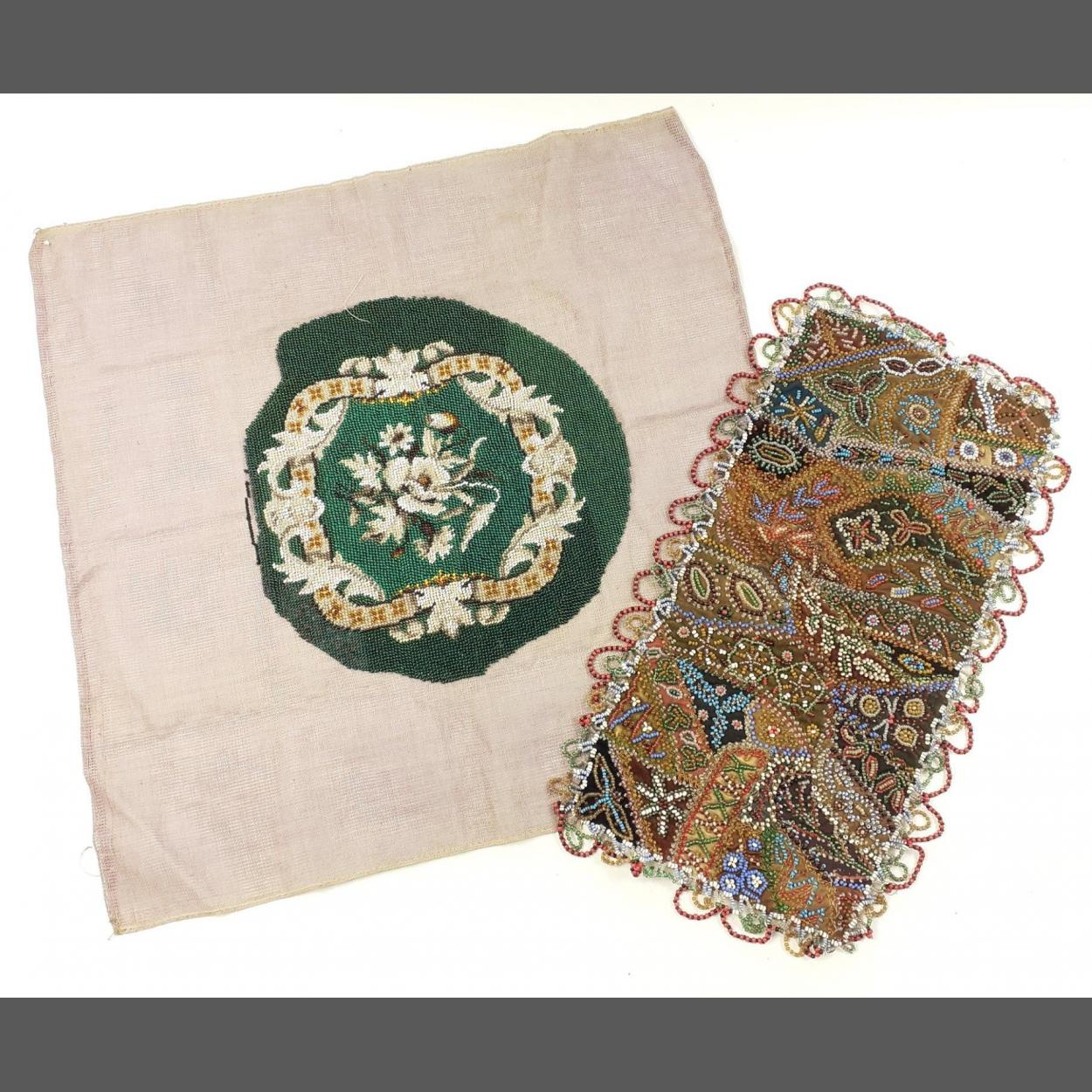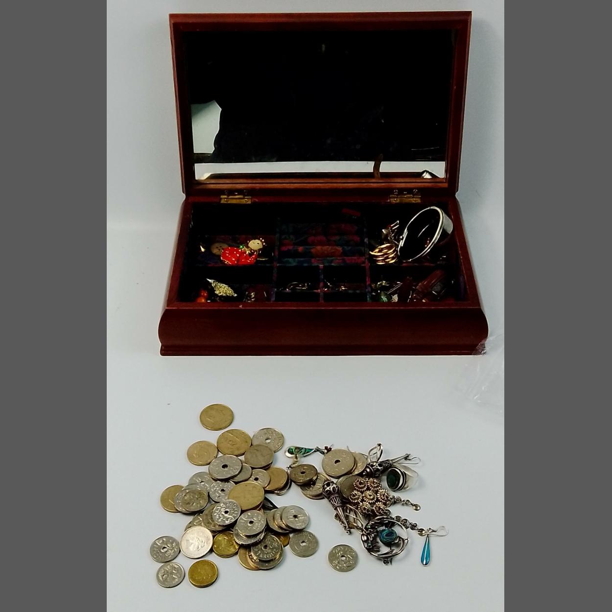 A small wooden jewellery box with tapestry inlaid in lid with contents of costume jewellery plus some sporting medals 19x14x6cm approx