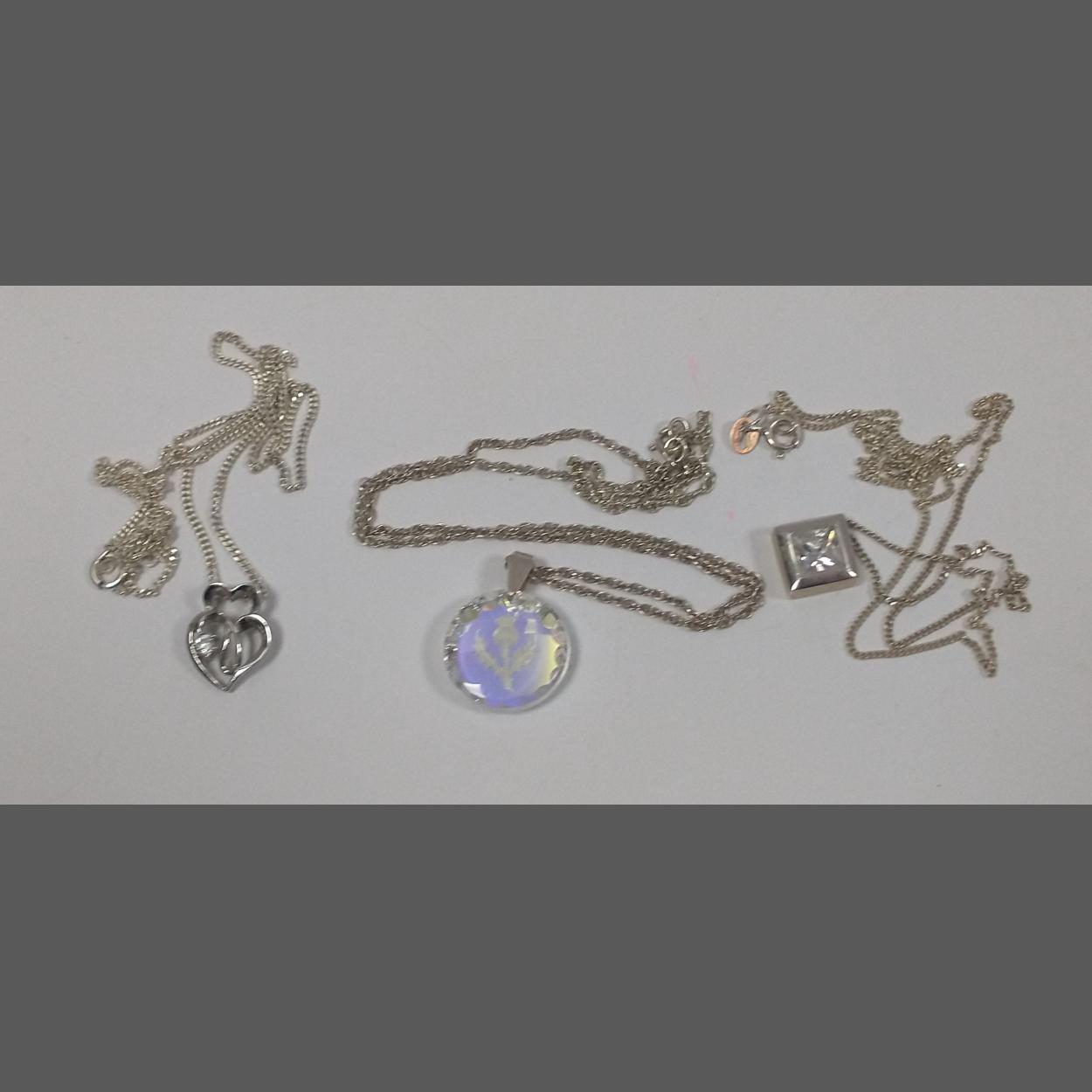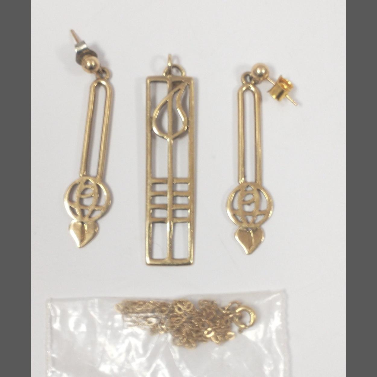 A pair of hallmarked 375 Rennie Mackintosh style earrings (4cm long) plus one 375 stamped pendant and a chain 46cm long stamped 375. Total weight 8.0g approx