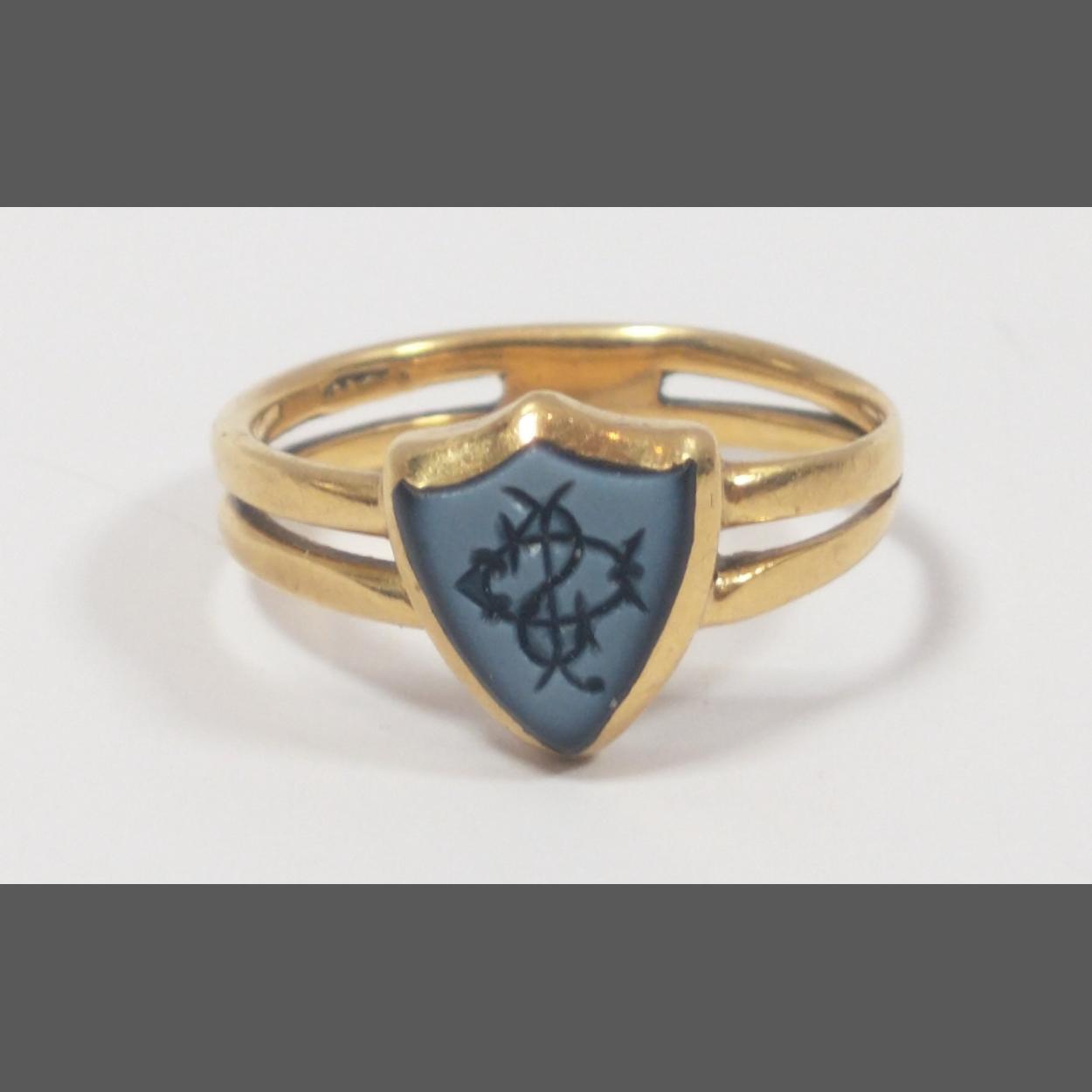 An unmarked yellow metal ring with well-worn marks, size M, with a seal with the letter 'S', gross weight 3.05g approx