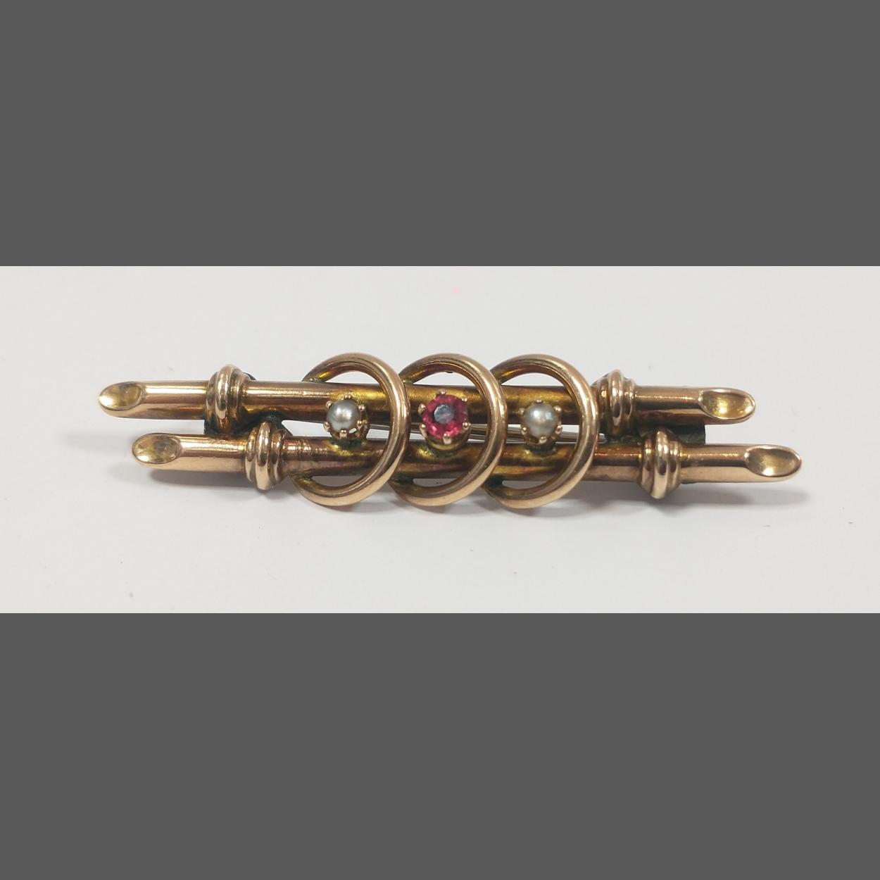 A rather pretty vintage brooch stamped 9c and 375, set with red stone and 2 seed pearls, with indistinct maker's mark GMV, 5cm long approx, gross weight 3.35g approx