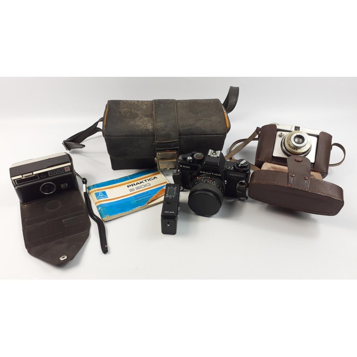 A selection of cameras to include an ILFORD Sporti in case with Dacora lens, a PRAKTIKA B200 camera with Pentacon lens, instructions and case,