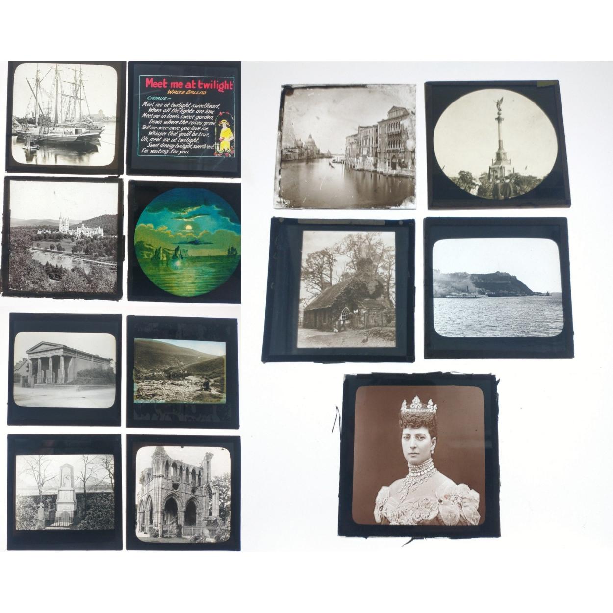 A small quantity of antique glass slides to include Queen Alexandra, Dryburgh Abbey, Highland Mary's Grave, Korsor Harbour and others.