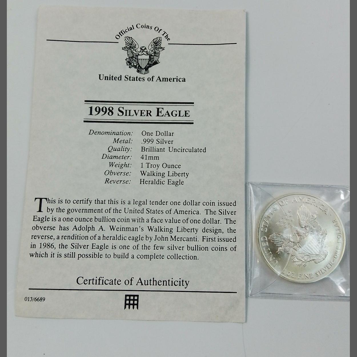 UNITED STATES of AMERICA 1998 Silver Walking Liberty Eagle. One ounce silver bullion coin with certificate.