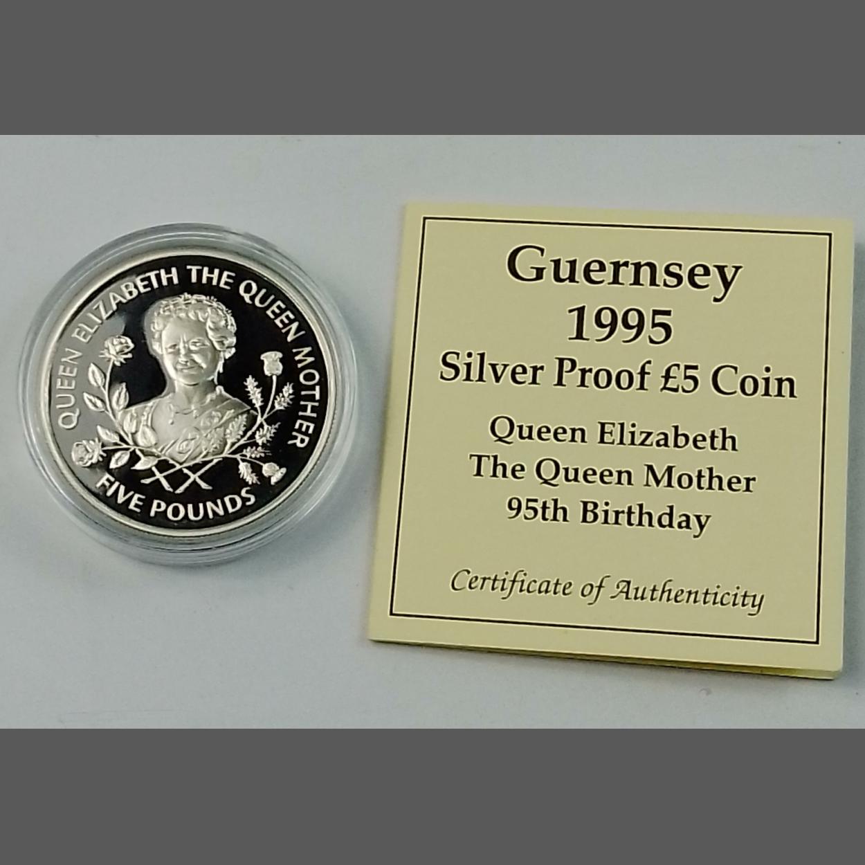 Guernsey 1995 Silver Proof bullion Five Pound coin celebrating the 95th Birthday of Queen Elizabeth the QUEEN MOTHER. Encapsulated in coin case and supplied with certificate.