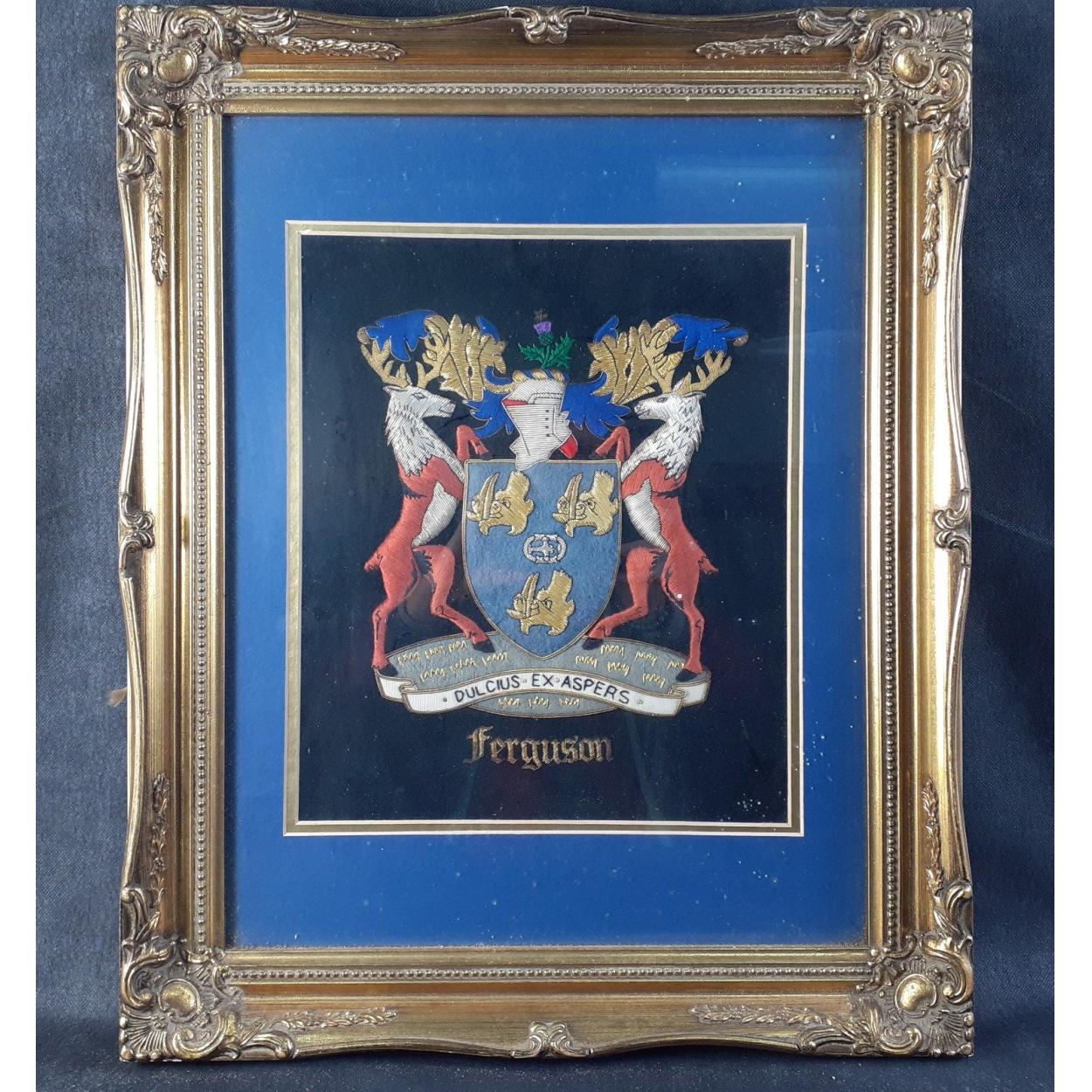 A large framed heraldic family crest, with padded embroidery and gold thread, a presentation piece for the FERGUSON family, frame size 54x44cm
