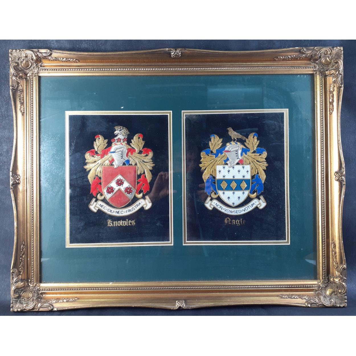 A large framed heraldic family crest, for the KNOWLES and NAGLE families, frame size 69x54cm